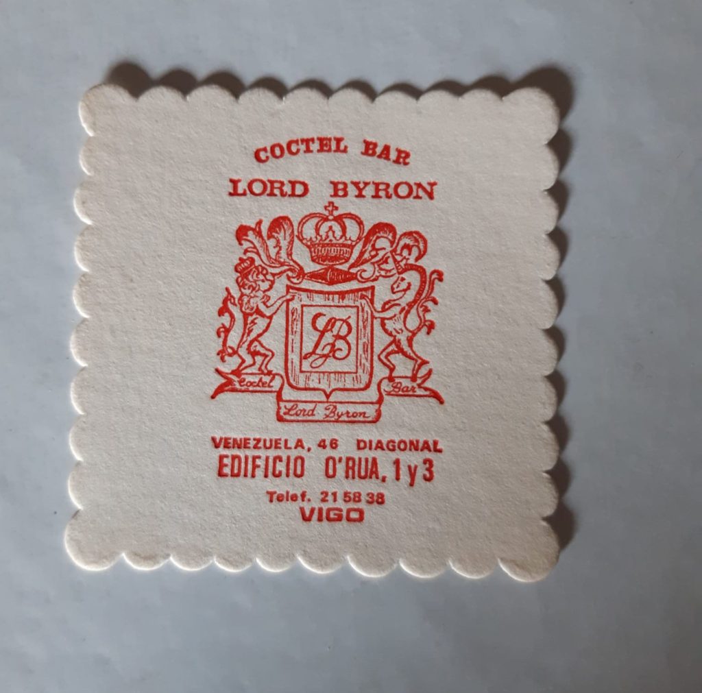 Otro posavasos corresponde a Lord Byron, que era un pub ya inexistente en la Rúa Padre don Rúa, cuando esa calle estaba sin desarrollar. Oliver era una discoteca histórica por la que pasaron generaciones de viguesas y de vigueses; cambió de nombre y de ambiente varias veces, sin embargo, aquel Oliver de los años setenta, con dos pistas, una de música lenta arriba y otra de música movida en el sótano, todavía permanece vivo en la memoria de Vigo. Son recuerdos populares de un Vigo que crece imparable y que se ha ido llevando la mayoría de todos esos lugares, sin compasión.
