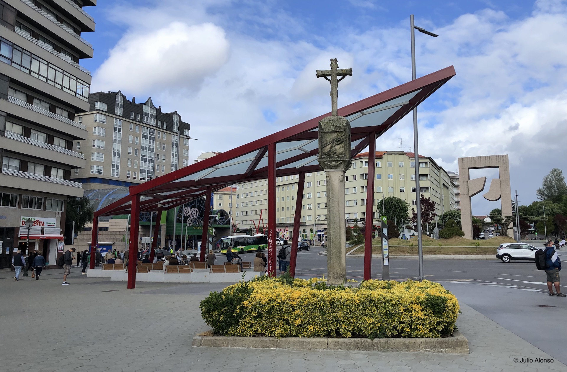 El barrio de As Travesas de la ciudad de Vigo se ha convertido en un centro urbano que compite con el centro tradicional y con otros centros neurálgicos como los barrios de O Calvario, Bouzas, o Teis. La Praza de América, que es la que muestra la fotografía, constituye un entramado de calles con diferentes direcciones en las que el tráfico resulta denso, con grandes edificios y con numerosos comercios.
