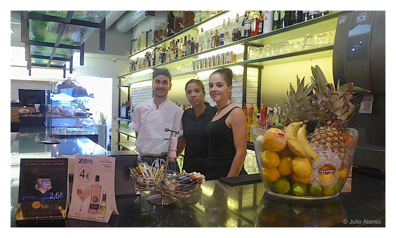 Y al cómodo entorno, decorado con elegancia y estudiados detalles, como un enorme jardín vertical que está colgado igual que un cuadro en la entrada, hay que añadir la gran profesionalidad y el trato excepcional de sus camareras y el buen hacer de su cocinero. Precisamente, una parte de esa plantilla la podemos observar en esta fotografía. De izquierda a derecha, Fabián, Eli y Sonia. Café Zoom, un lugar muy recomendable a cualquier hora del día.