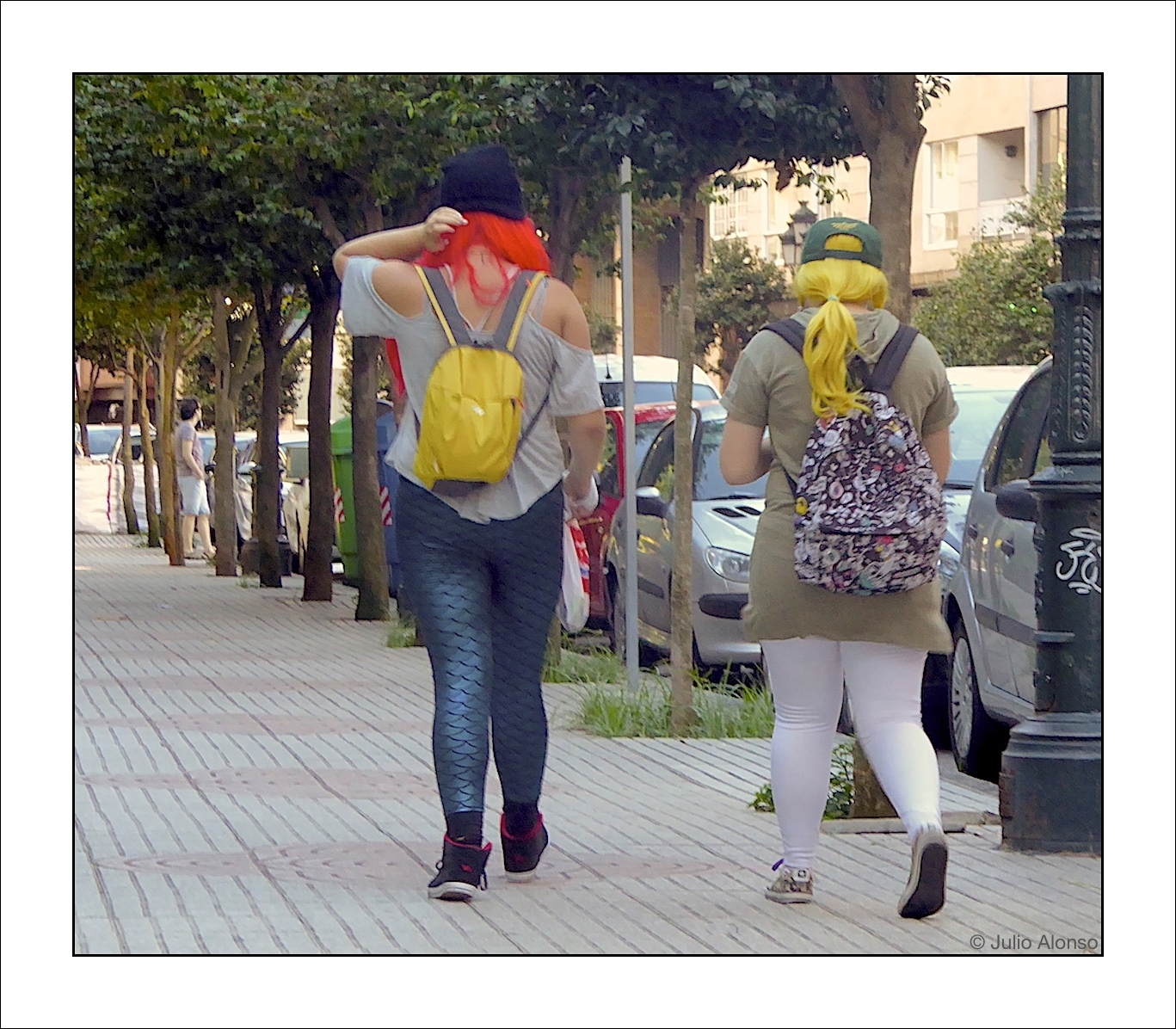 Las modas de ahora ya no están definidas y limitadas por las temporadas, el único límite actual es el gusto personal o la tribu urbana en la que cada uno pretende ubicarse. Las dos chicas de la foto sirven de ejemplo. Ellas pasean distendidas y sin ningún tipo de complejo, ajenas a las miradas de los demás transeúntes, a pesar de sus cabellos teñidos con unos colores fuertes, intensos, irreales, unos colores que dan una pincelada de cromatismo y alegría a la tristeza cotidiana.