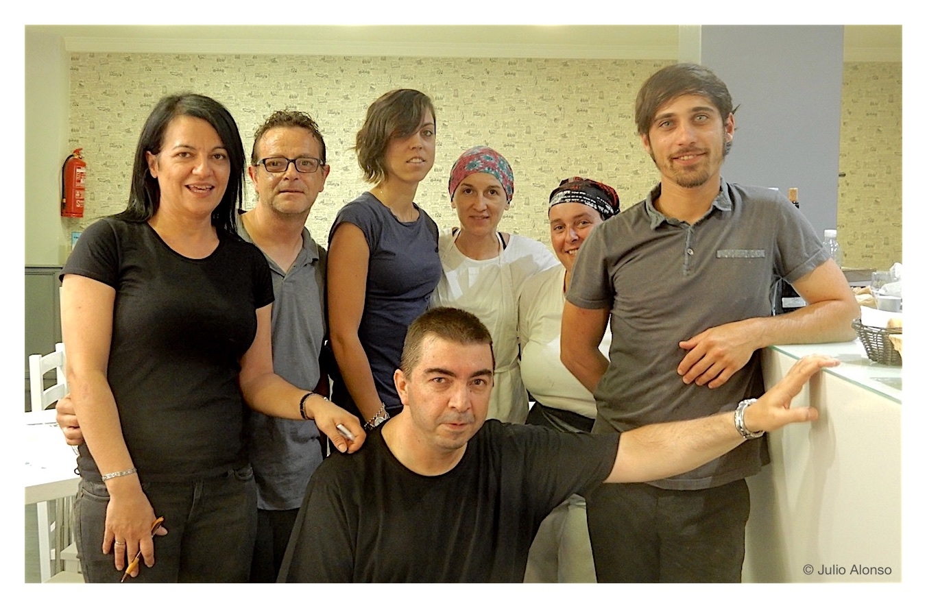 Y para quien quiera probar esa cocina de productos perfectamente reconocibles, de calidad, sencilla, de sabores tradicionales, en cantidades suficientes para saciar el hambre además de satisfacer el paladar, y todo ello a un precio muy asequible, debe visitar “El Descanso”, ubicado en la calle Salamanca número 8 interior, de la ciudad de Vigo. Además de un amplio comedor también tiene una agradable terraza en un gran patio tranquilo y decorado con grafitis singulares, frente al hospital Povisa, con una entrada adicional por la calle Zaragoza 51. “El Descanso” surgió hace unos años como una iniciativa empresarial de María Alonso Estévez, que demuestra diariamente una gran capacidad de trabajo y le imprime un estilo muy personal, dirigiendo a un gran equipo de profesionales totalmente entregados, amables, y perfectamente coordinados. “El Descanso” está abierto todos los días de la semana y su carta es tan amplia y variada, con pescados, carnes y vegetales, que todo el mundo queda complacido; allí no existen artificios, sino productos naturales cocinados con sencillez y esmero y perfectamente reconocibles: merluza, sardinas, xoubas, pez espada, carne asada, carrilleras, ensaladas, empanadas, pastas… Además de todo ello, el servicio es muy amable y muy rápido, y quien descubre “El Descanso” por primera vez queda gratamente sorprendido y lo recomienda a sus amistades sin temor a equivocarse. En la fotografía podemos observar al equipo de profesionales, de izquierda a derecha: María, Carlos, Sonia, Mónica, Olga y Javier, con Vicente en primer plano. Créame, no quedará defraudado.