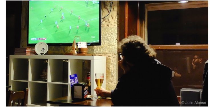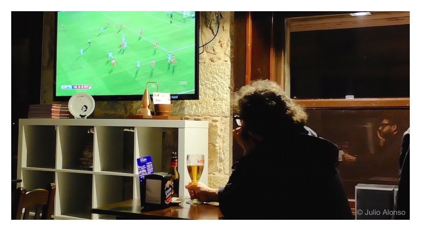 Pero no existe equipo capaz de ganar todos los partidos y de hacerse con todos los triunfos; el fútbol es un juego en el que intervienen numerosos factores y a veces también se pierde, de no ser así, los más entendidos acertarían siempre en las quinielas deportivas. El Celta, siendo un equipo humilde, ha demostrado un comportamiento deportivo excelente, y nadie duda que esa es la consecuencia de una buena gestión de sus directivos que abarca lo deportivo y lo económico, porque las cuentas saneadas también constituyen un triunfo. En esta época, la ciudad de Vigo confía plenamente en su equipo e incluso palpita con él, así, en la fotografía podemos observar a un aficionado que está viendo un partido del Celta en la televisión, con la única compañía de una cerveza, animando a su equipo aunque sea en la distancia.