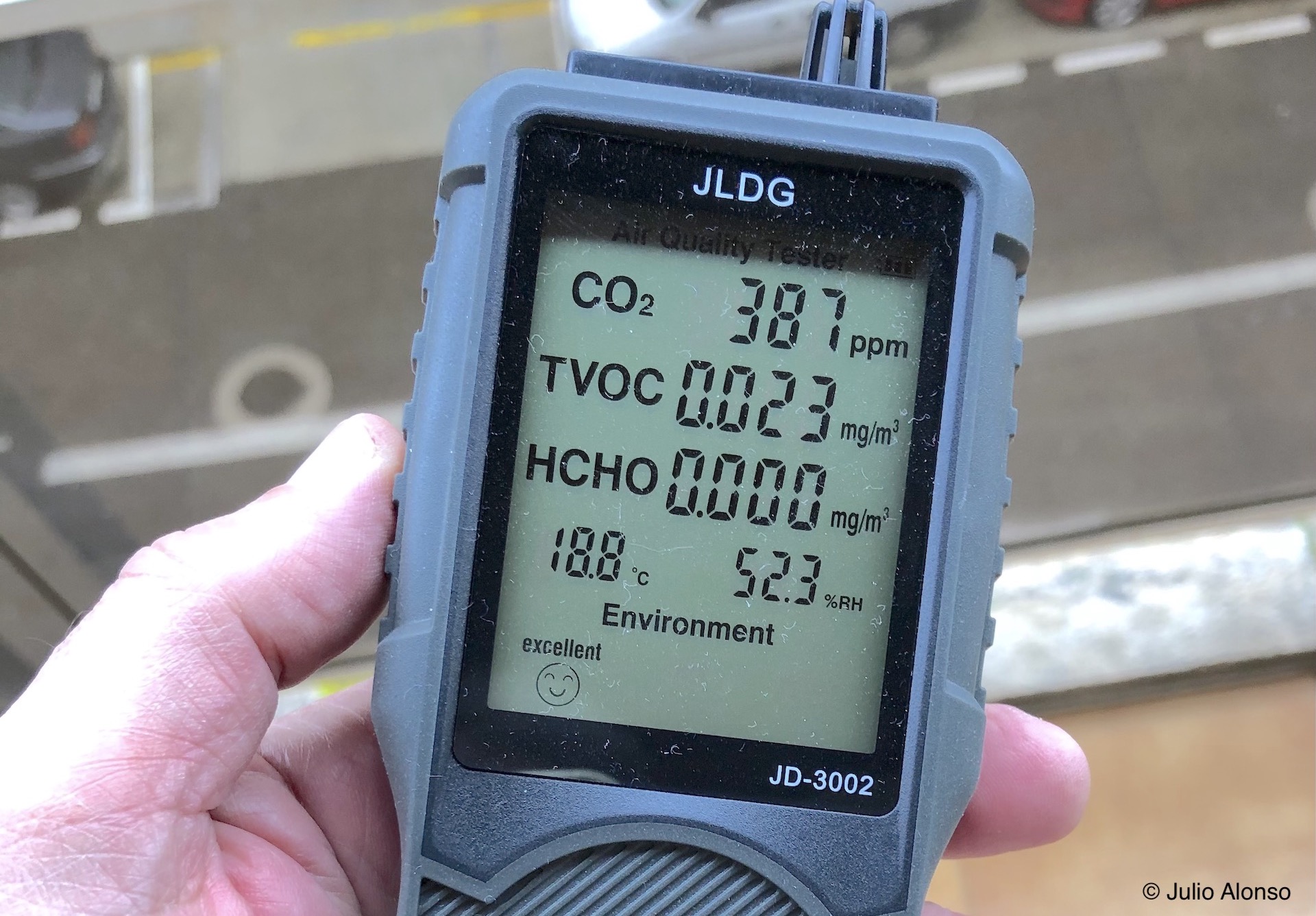 Para que el aire sea considerado limpio en el exterior los valores de CO2 oscilan entre los 360 ppm y los 700 ppm. También existen instrumentos similares que actúan automáticamente sobre ventiladores, de tal modo que la ventilación mecánica entra en funcionamiento cuando los valores lo aconsejan, un método muy indicado en estos momentos para aulas, oficinas y hospitales. El muestreo que indica el aparato de la fotografía, colocado al aire libre en un balcón, acusa una ligera polución en una calle céntrica de Vigo donde el tráfico rodado es intenso.