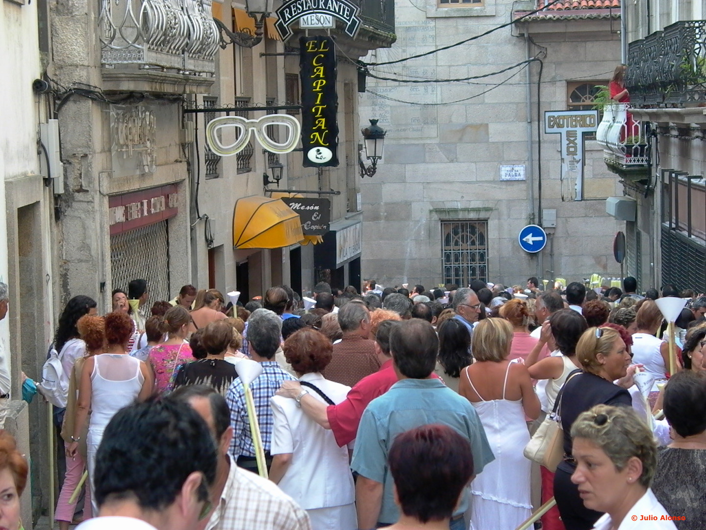 Esta fotografía fue tomada hace varios años en la Rúa Triunfo de la ciudad de Vigo. Se trata de la procesión del Cristo de la Victoria, el acto religioso de mayor respuesta ciudadana. El propio día de la celebración, e incluso en los días previos a la celebración religiosa, pero sobre todo antes de la procesión, se forman largas colas para entrar en la Colegiata, la iglesia donde se guarda la imagen de ese Cristo tan venerado que según las leyendas existentes fue encontrado en el mar.