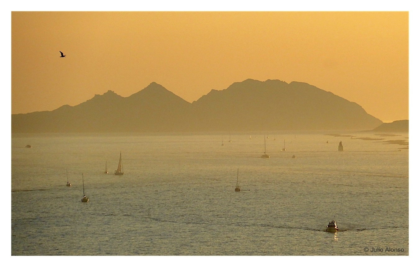 La ría se llena diariamente de embarcaciones de todo tipo y dimensiones que se desplazan por los numerosos rincones que esconde nuestro litoral. Uno de esos destinos son las Islas Cíes, que siguen a la espera de ser declaradas Patrimonio de la Humanidad. Mientras tanto, miles de personas las visitan diariamente para disfrutar y luego dar testimonio de una belleza incomparable, de un paraíso cercano. En la fotografía se puede observar el regreso de numerosas embarcaciones que vuelven a puerto desde las Islas Cíes al caer la tarde, cuando los colores del horizonte se tornan intensamente dorados en previsión de un nuevo día caluroso, tal como tradicionalmente interpretan las gentes del mar.