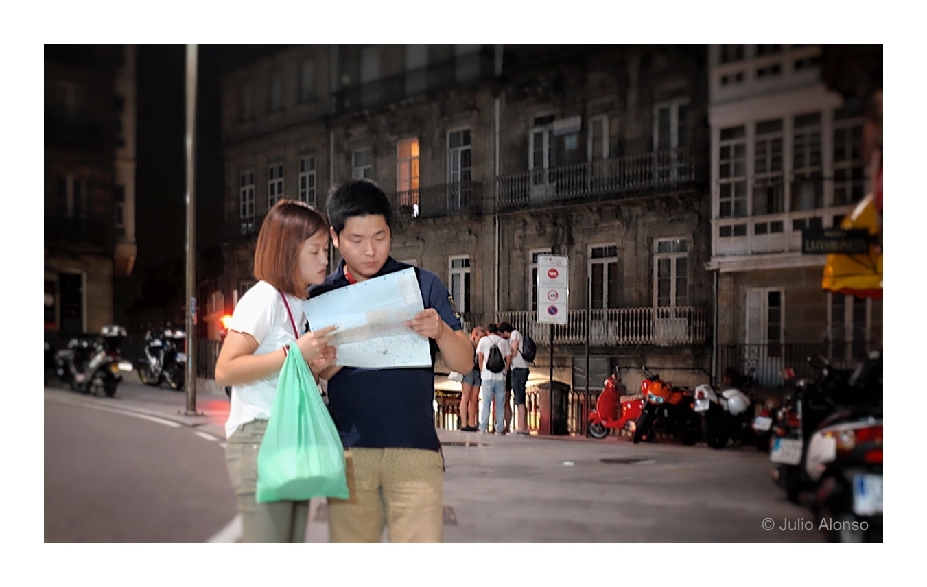 Y los resultados están a la vista y los podemos observar en las calles y plazas, llenas de forasteros, con una ocupación hotelera espectacular y un éxito hostelero sin precedentes. Y para muestra, esta pareja de japoneses que aparecen en la fotografía, que están consultando un plano de la ciudad a últimas horas de la tarde, de lo que se deduce que no se trata de una simple visita de unas horas, sino de una escala deliberada, siquiera por un par de días.