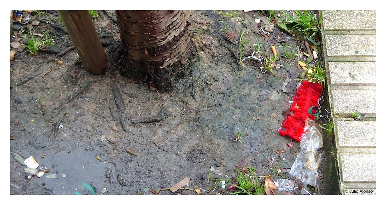 Aunque el ciudadano no lo perciba en toda su extensión, en los núcleos de población existen servicios e infraestructuras más o menos complejas que, en mayor o menor medida, se encargan de retirar los residuos y, en algunos casos, de darles una reutilización, de eliminarlos definitivamente, o, siquiera, de neutralizar sus efectos. Pero todo este complejo entramado de tratamiento de residuos requiere de la participación ciudadana, de que exista una selección previa, y de que se utilicen los canales adecuados para depositarlos. La fotografía da buena cuenta de una mala praxis: junto a un árbol se han tirado los despojos de alguna bacanal. Se pueden observar papeles de confeti, una liga que aporta tejido y goma, colillas de cigarro que aportan unos filtros muy difíciles de reciclar, y un preservativo que, al margen de ñoñerías, además de la contaminación orgánica que genera su material también presenta un peligro por las posibles infecciones, y provoca una imagen penosa de una sociedad que todavía no está sensibilizada con el reciclado, porque la culpa de todo esto, realmente, la tiene la ciudadanía.
