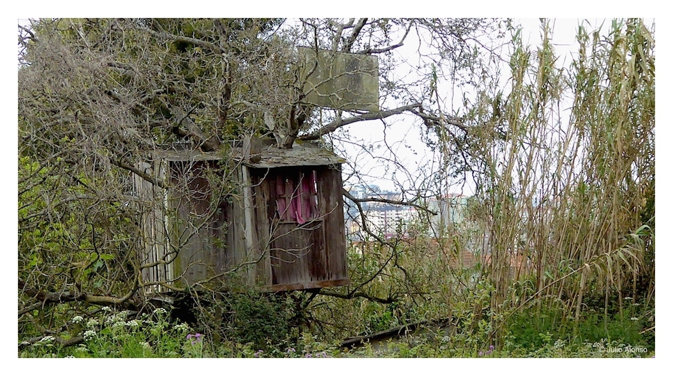 Muchas personas viven al límite de sus posibilidades y algunas ya lo han perdido todo. Sin embargo, la vida continúa y el ser humano encuentra soluciones para sus problemas cotidianos donde nadie lo hubiera imaginado. La casa de la fotografía da buena cuenta de ello. La imagen está tomada en la Estrada Clara Campoamor, la vía que conduce al hospital Álvaro Cunqueiro y a la Universidad de Vigo, pero pasa inadvertida para la mayoría de los conductores y de los pasajeros, atentos, quizá, a sus cuitas o a las vistas de la ciudad de Vigo con la ría y las islas Cíes en la lejanía. Son malos tiempos, pero algunas personas siguen echando raíces donde la vida se lo permite.