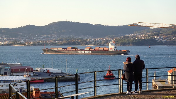 La fotografía muestra uno de los rincones más bellos de la ciudad de Vigo. Se trata del mirador del Paseo de Alfonso XII, desde donde se puede contemplar una gran parte de la ría, con las islas Cíes al fondo. También se pueden observar los movimientos de la zona pesquera y la entrada y la salida de mercantes de todos los tamaños, como ese gigante de Hapag-Lloyd que aparece cargado de contenedores y que parte con destino a un lugar lejano del mundo. Al fondo, como contraste del bullicio urbano y de la frenética actividad portuaria, se observa la península de O Morrazo, con poblaciones acogedoras como Cangas y Moaña y con playas pequeñas y grandes de fina arena blanca que se asoman a esa ría cargada de historia y de leyendas. Los piratas turcos y los corsarios ingleses surcaron sus aguas y en las profundidades quizá todavía queden restos de los valiosos tesoros que traía de las indias aquel convoy de barcos españoles y franceses que fue atacado y vencido por la armada anglo-holandesa al fondo de la ría, en la bahía de San Simón, en el año 1702. El balcón del Paseo de Alfonso XII es un balcón para dejarse llevar y soñar, es el balcón de Vigo.