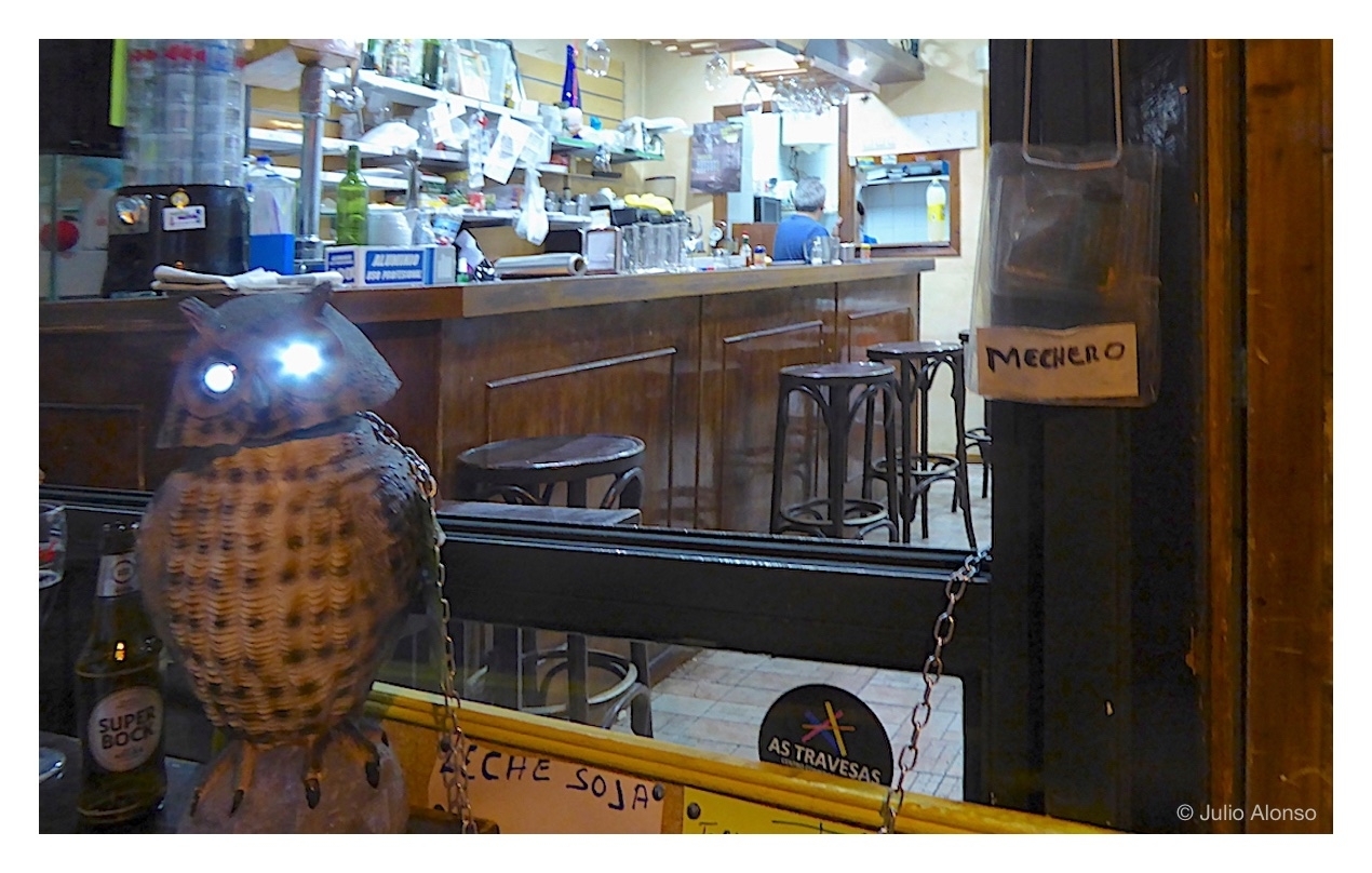 Hoy, aquello de pedir fuego como necesidad o como disculpa para entablar un conocimiento y una relación social se va perdiendo. Por eso, en algunos establecimientos ya tienen un mechero a disposición de los clientes que lo necesiten, como es el caso que se observa en la fotografía, tomada en un lugar, por cierto, muy recomendable por la variedad y la calidad de sus tortillas, además de la amabilidad del servicio y de un precio muy asequible. Se trata del bar “El Brillante”, ubicado en el último tramo de la calle Barcelona, de Vigo. Allí han puesto el mechero en una bolsa transparente a disposición de los clientes. Y vigilado, eso sí, por un búho que, como puede comprobarse, no le quita el ojo a nadie que se acerque. “El Brillante”, un lugar pequeño, pero muy recomendable para tomar una cerveza y unos buenos pinchos.