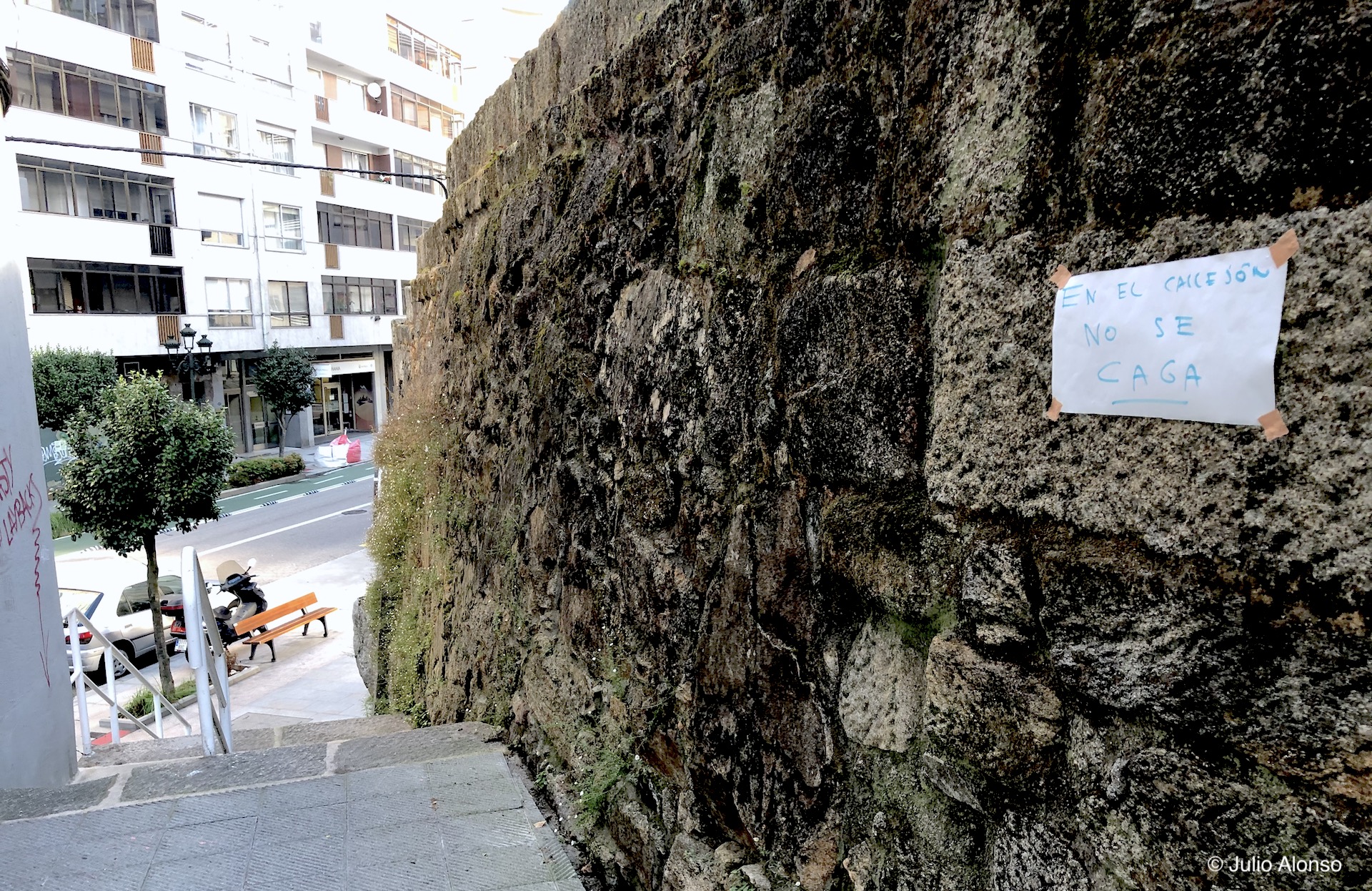 Esta fotografía está tomada en el Camiño da Pousa, que enlaza la Avenida das Camelias con la Rúa Pintor Colmeiro. En otra ocasión ya hemos comentado que el Camiño da Pousa es un pequeño callejón muy utilizado como atajo entre ambas calles principales y para el acceso al ambulatorio de Pintor Colmeiro y a Povisa. Aunque no es habitual, algunos dueños de perros también los pasean por esa vía donde aparcan coches y por donde se accede a los almacenes y entradas de servicios del Hospital Nicolás Peña. Pero hoy traemos aquí esta fotografía porque algún vecino ha colocado un cartel protestando porque alguien utiliza ese callejón como váter. Se desconoce quién ha puesto el cartel y, por supuesto, quién se dedica a evacuar en esta vía pública, por muy grande y desesperado que sea el apretón. Quien haya sido seguramente lo ha hecho amparándose en la oscuridad y en el silencio de la noche, porque durante el día no pasaría inadvertido y se merecería un buen apercibimiento.