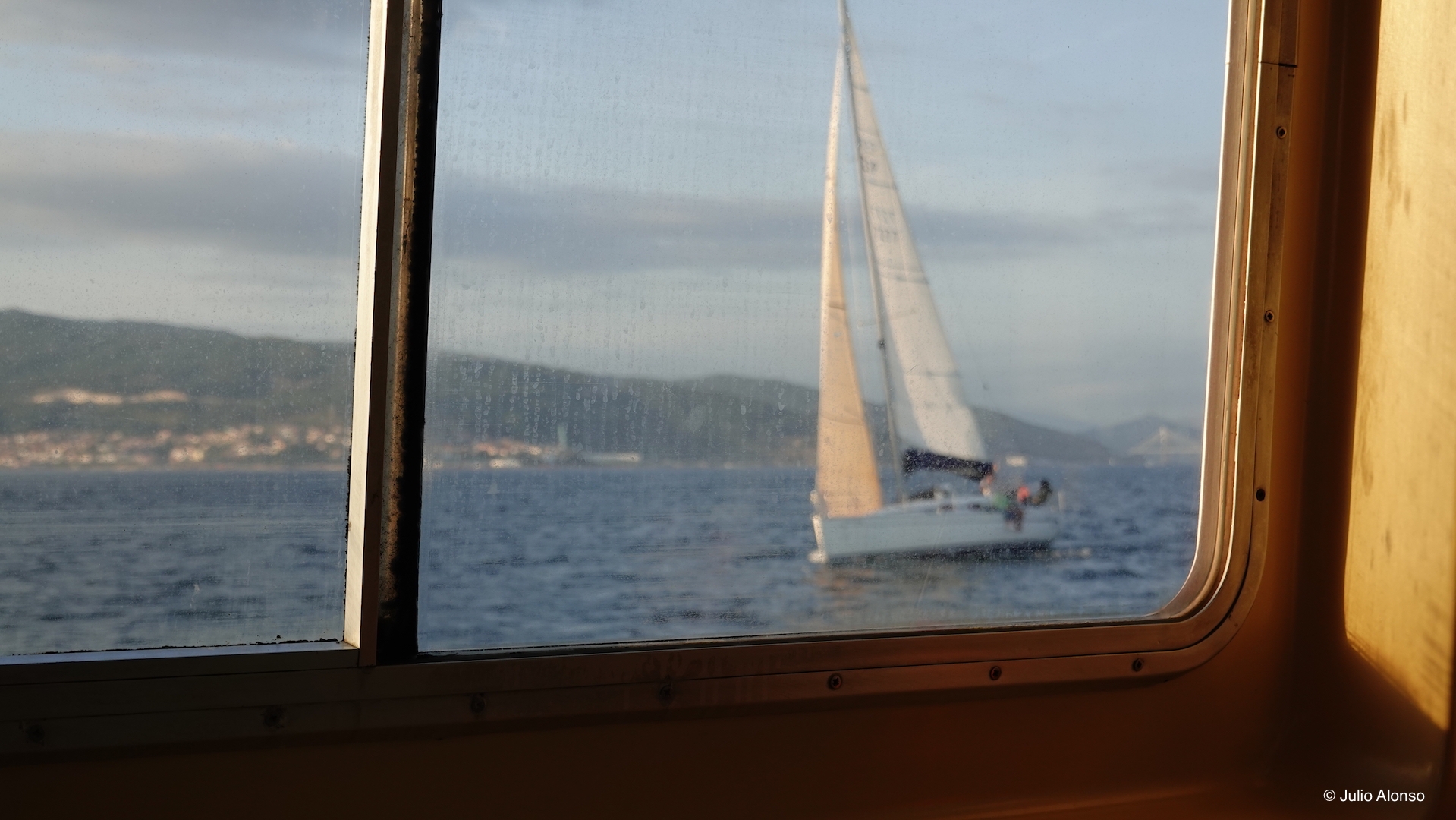Me gusta mucho esa imagen a nivel del mar con el velero navegando al otro lado del cristal y la costa de O Morrazo a lo lejos, desdibujada en la distancia y en medio de la bruma. Es el recuerdo de una tarde tranquila regresando a Vigo desde Cangas, con la familia y rodeados de gente, disfrutando del balanceo de las olas y de la luz del atardecer, todos juntos en el camarote.