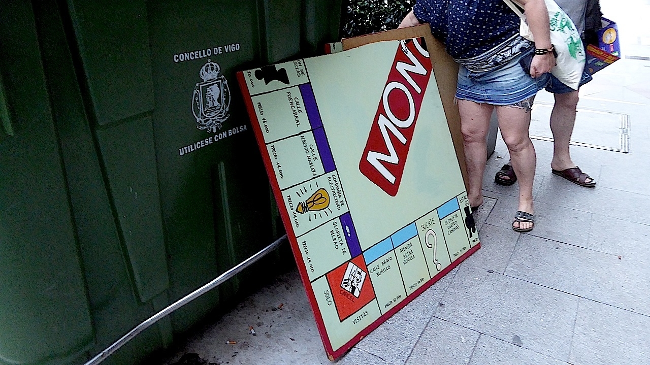 Se trataba del popular juego del Monopoly, en el que los jugadores reparten una fortuna inicial y luego entran a formar parte del mercado especulativo de la construcción. Allí se compran y venden calles enteras y edificios, e incluso se solicitan créditos bancarios. Sin embargo, también puede acontecer la ruina en el momento más inesperado, o el ansiado golpe de suerte que convertirá a un jugador en el más adinerado. El juego dura bastante tiempo, el suficiente para que los más especuladores, con un mayor conocimiento de las estrategias empresariales, con la valentía suficiente para llevar a cabo sus planteamientos, y sin ningún tipo de compasión, traten de hacerse con todo el mercado. En fin, como la vida misma. Y quizá el tamaño desproporcionado del tablero corresponda a algún modelo con el que practican los profesionales de la vida real.
