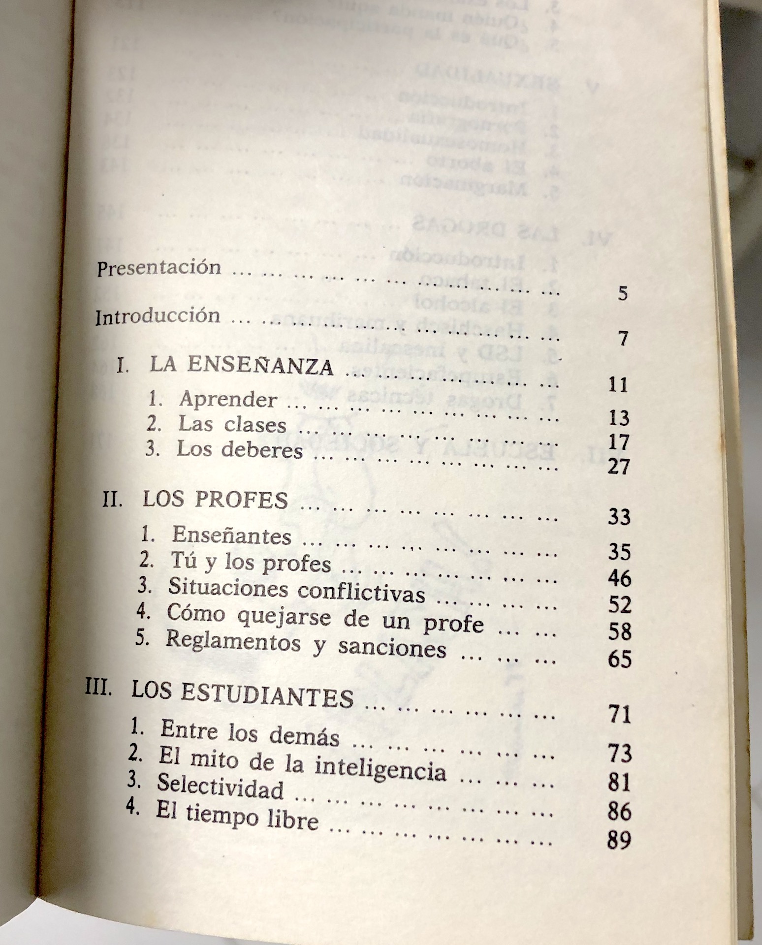 Su contenido era una crítica al sistema educativo y estaba lleno de consignas para una rebelión en las aulas y para la indisciplina, para la defensa de los intereses del alumnado, un libro que hablaba de sexo, de drogas, de insurrección. Explicaba, por ejemplo, cómo realizar una queja, como controlar el abuso de poder, se extendía en los apartados más llamativos de la sexualidad, con apartados para la pornografía, la homosexualidad y el aborto, entre otros, así como de las drogas, entre las que consideraba el tabaco, el alcohol, la marihuana y el LSD.