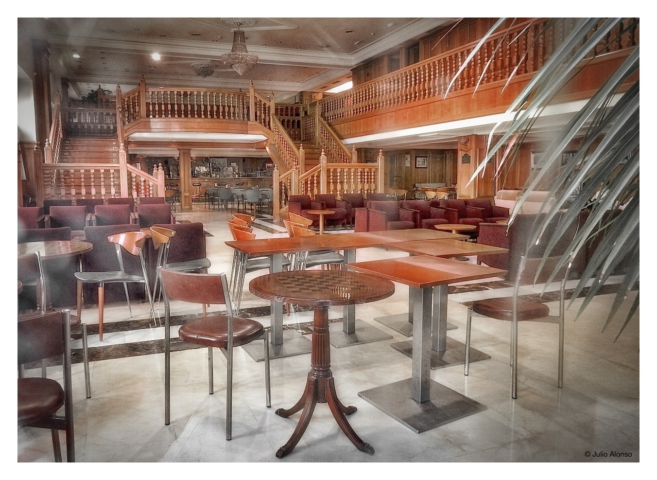 Esta sede fue inaugurada de modo oficial por los entonces reyes de España don Alfonso XIII y doña Victoria Eugenia en el año 1927. A lo largo de su historia, el local ha experimentado diversas remodelaciones, en el año 1975 se inaugura la Ciudad Deportiva, y el número de socios ha ido creciendo hasta llegar a superar la cifra de diez mil. Miles de personas han entrado en sus instalaciones y han disfrutado de su servicio de biblioteca, de su cafetería y de sus salones, de sus instalaciones deportivas, de sus fiestas… Pero la crisis, fundamentalmente, ha conducido a la sociedad a una situación difícil que ha desembocado en la venta de la histórica sede. Esta fotografía ya no tiene nada que ver con la realidad actual. Las obras de remodelación realizadas por el nuevo propietario —que sin duda acertará con la adaptación para los nuevos fines— se han llevado por delante los recuerdos que afloran ahora al contemplar esta imagen de los salones de la planta baja, con la cafetería al fondo y la escalera de madera que subía al entresuelo. Cuántas tertulias y animadas charlas, cuántas tardes de reposada lectura, cuántos recuerdos que ahora sólo forman parte de la memoria.