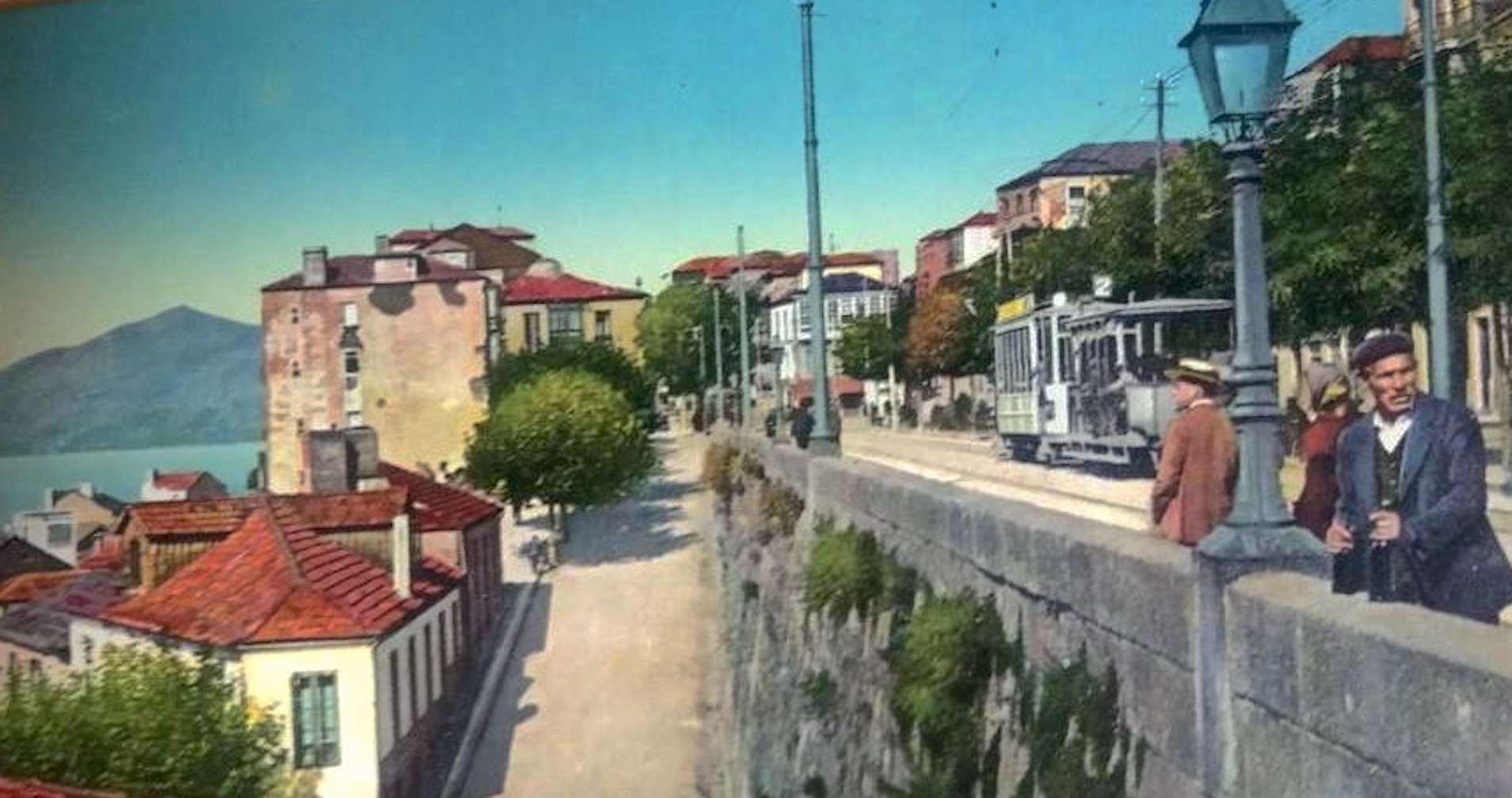 Esta fotografía de principios del siglo XX y de autor desconocido corresponde a una antigua postal de la ciudad de Vigo. La imagen muestra el Paseo de Alfonso XII, todavía sin la artística barandilla y sus correspondientes adornos de piedra, simplemente con unas pequeñas farolas y unos postes para el tendido eléctrico. Se observa, también, el paso del tranvía, que fue operativo hasta finales delos años sesenta. Las casas que aparecen visibles, salvo alguna excepción, no han sufrido cambios radicales, aunque, posteriormente, alguna de ellas, de la Rúa Poboadores, ganó en altura y actualmente queda al límite de las vistas del mirador, seguramente por la permisividad de alguna autoridad municipal que hizo negocio con unas vistas que son de toda la ciudadanía. Resulta llamativo que el olivo ya estaba en su ubicación actual, y que todavía no se apreciaba la acera volada de la Rúa Poboadores.