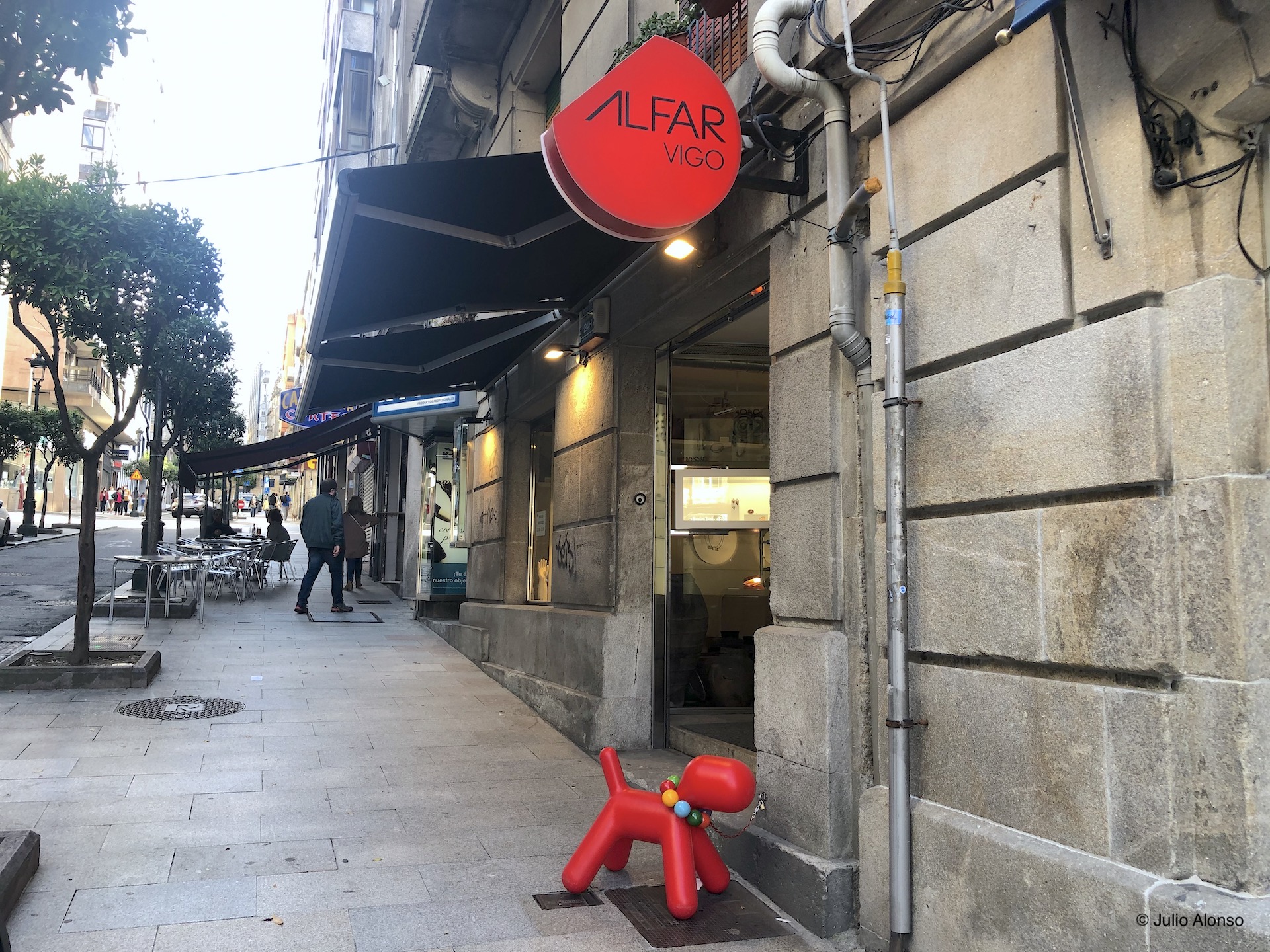 Esta imagen corresponde a la Rúa Hernán Cortés, en la ciudad de Vigo. El detalle curioso de la fotografía es ese perro de plástico que está atado a la puerta del comercio para evitar que se lo lleven los amigos de lo ajeno. Además, el perro también constituye un reclamo con su llamativo color rojo y con su collar multicolor. El comercio se llama Alfar y está especializado en la artesanía. En sus escaparates -y en su interior- se puede comprobar que tienen detalles de muy buen gusto realizados en distintos materiales como el aluminio o el acero, por ejemplo, con el sello de diferentes autoras y autores, y con unos precios muy asequibles para constituir obras de diseño singulares. Una visita muy recomendada para quienes admiran las verdaderas joyas artesanales.