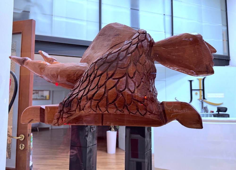 La impresionante estatua de Francisco Leiro conocida como El Sireno, y ubicada en la Porta do Sol de la ciudad de Vigo, se ha convertido en uno de los símbolos actuales de la ciudad olívica. Inicialmente se llamó “El hombre pez”, puesto que no deja de ser una mezcla de ambos, sin embargo, pronto fue conocida con el popular nombre de El Sireno, y así ha quedado. La escultura está magistralmente realizada en acero inoxidable y está colocada a once metros de altura sobre dos columnas de mármol negro. La obra es realmente singular y no deja a nadie indiferente, con sus extrañas formas y con su enigmática mirada perdida en dirección al mar. Tal es la admiración que despierta El Sireno en nativos y foráneos que incluso un carpintero con dotes escultóricas lo ha reproducido a pequeño tamaño, tal como puede observarse en la fotografía. Esa pequeña imitación de El Sireno está decorando la entrada del Hotel Lino, en el número 26 de la Rúa Lepanto, en las proximidades del complejo Vialia. No es la obra original, la que está en la Porta do Sol, pero es digna de admirar.