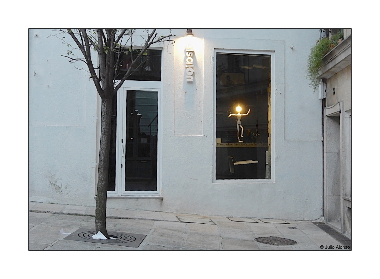A través del cristal se observa un muñeco articulado de madera, de los utilizados en artes plásticas, con una bombilla iluminada en su cabeza, seguramente como signo de que las ideas más brillantes están ahí, en la cabeza, y que por eso es preciso cuidarla y mimarla, tanto por dentro como por fuera, algo en lo que, precisamente, están especializados en este establecimiento que podemos encontrar en la calle Joaquín Yañez, de Vigo, y que lleva por nombre “Elsalón», porque el verdadero cambio ocurre en la cabeza.