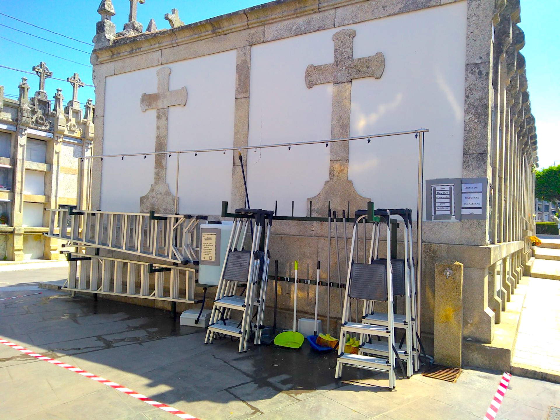 Matamá es una de las parroquias más importantes del municipio de Vigo, aunque su verdadero nombre es San Pedro de Matamá. Tiene una gran riqueza arqueológica y en su cementerio, justo a la entrada, puede observarse el único cruceiro de la parroquia, que data de 1691. Curiosamente, en ese cementerio solamente están enterradas personas de Matamá o que tengan alguna vinculación con la parroquia. También es digno de resaltar, en estos tiempos de pandemia, de confinamiento y de apertura escalonada por fases, el sistema de desinfección de Covid19 implantado en el cementerio parroquial. Cualquier utensilio, incluyendo escaleras, escobas y recogedores, puede —y debe— ser desinfectado en la instalación que muestra la fotografía. Se trata de unas medidas eficaces de precaución que bien merecen el reconocimiento general y que deben ser tenidas en cuenta como un ejemplo a seguir.