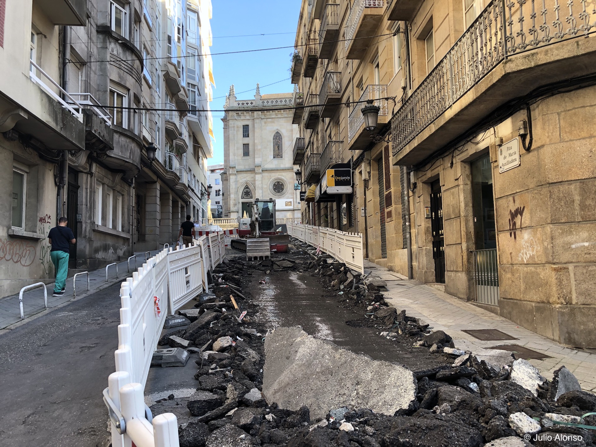Una de esas zonas que se están mejorando en la actualidad es la Ronda de Don Bosco y la Rúa de María Auxiliadora. La fotografía que se muestra corresponde a la Rúa de María Auxiliadora, que conecta la Ronda de Don Bosco con la Rúa Progreso en su intersección con la Rúa López de Neira. Cuando las obras estén terminadas los vecinos se beneficiarán de las mejoras, así como los establecimientos hosteleros de la zona. Un acierto.