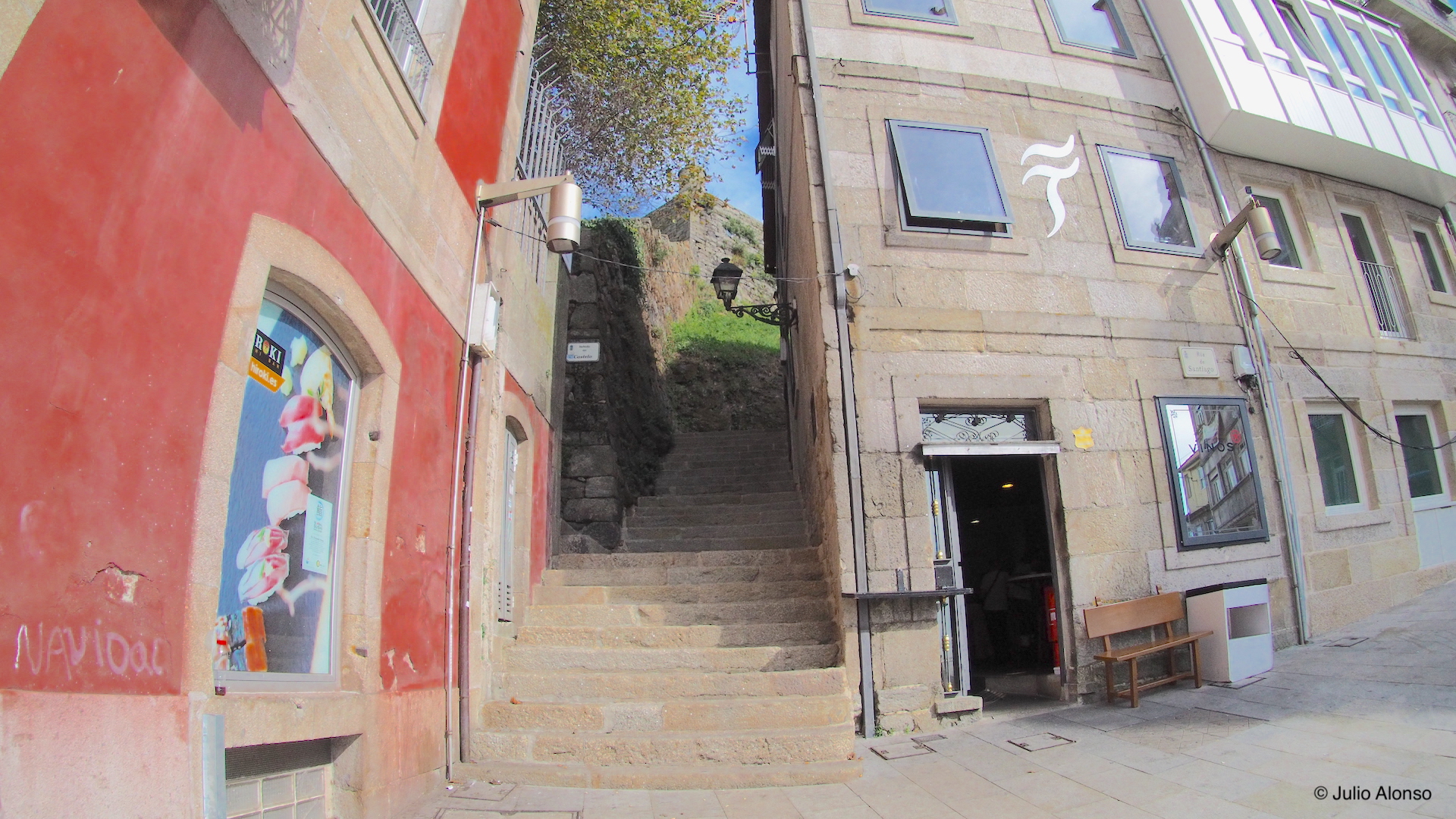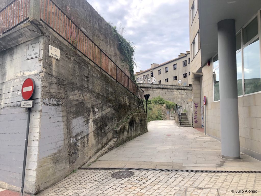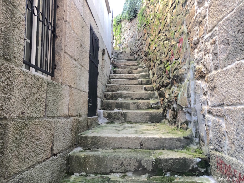 A mitad de la Rúa de Santiago existen unas escaleras que pasan inadvertidas para muchas personas que aprovechan esta vía para acortar el camino entre la Praza do Rei y el Paseo de Alfonso XII. Se trata de unas escaleras estrechas, muy empinadas y de gigantescos peldaños de piedra que comunican con el Calexón Estreito, en la parte posterior del edificio del Concello, y que son tan incómodas para subir como para bajar.