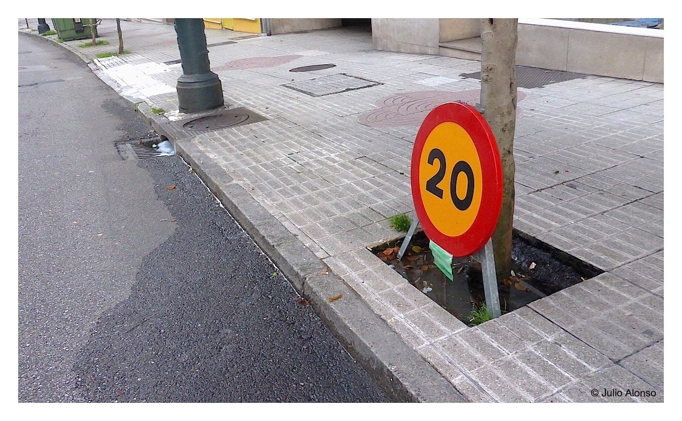La lluvia casi ha borrado por completo la dedicatoria, presumiblemente de un cumpleaños, pero la señal continúa en su sitio sin que nadie la haya recuperado para su auténtica finalidad. Así, al cabo de varias semanas apoyada en un árbol, los transeúntes ni siquiera reparan en su presencia. Es como un recuerdo vago de un aniversario que pronto se perderá en la memoria de quienes ayudaron a su celebración, pero que no será olvidado por quien lo haya protagonizado. Ya se sabe que a medida que se van cumpliendo años la vida parece avanzar cada vez más rápido, y será entonces cuando añore aquella limitación de los veinte.