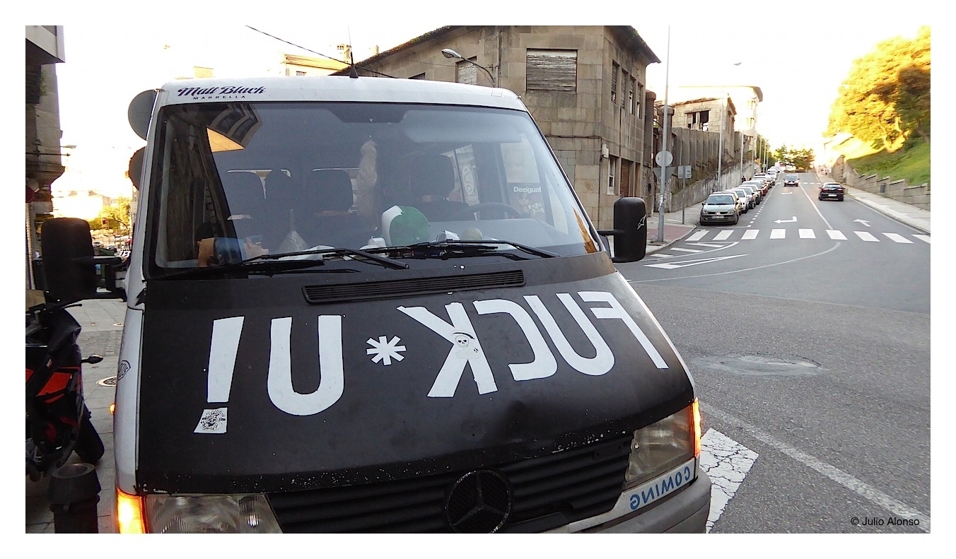 Sin duda, son nómadas de nuestros tiempos, volcados en un camino sin fin y lleno de aventuras donde la simpatía resulta un combustible indispensable para no quemarse y no arredrase ante las dificultades y los imponderables. Estaba aparcada en una céntrica calle viguesa, y la mayoría de los transeúntes no eran capaces de reparar en el verdadero significado de su decoración delantera, en esa inscripción dispuesta de modo similar a la utilizada por los vehículos de emergencias: ambulancias, bomberos, policía…, que se lee al revés en el espejo retrovisor. Dice “Fuck u!”, expresión inglesa escrita de modo contraído en referencia a “Fuck you”, “Jódete”, que el conductor que va delante tendrá que tomar obligatoriamente con filosofía y con buen humor para no enzarzarse en una discusión que no llevaría a ninguna parte. Cosas de nuestros tiempos.