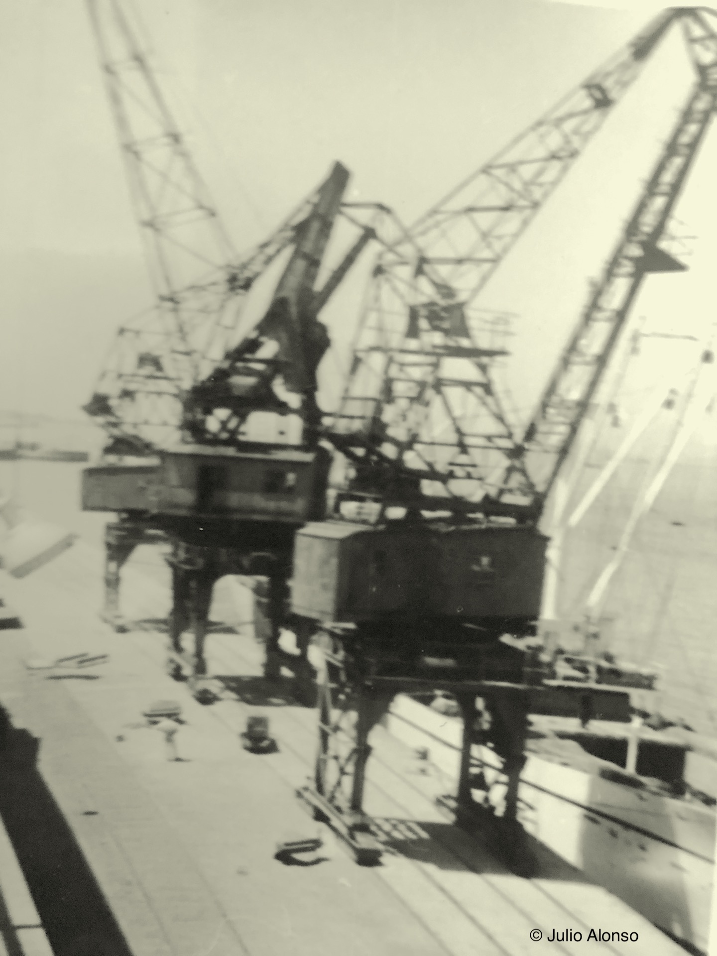 Las nuevas generaciones de viguesas y vigueses no reconocerán esta imagen. Corresponde a la Estación Marítima de Vigo a mediados de los años sesenta del pasado siglo XX. Pueden observarse tres grúas que se desplazan sobre raíles a lo largo del muelle de trasatlánticos. Su gran tamaño para aquella época puede apreciarse comparándolo con el de la persona que aparece junto a ellas. Eran utilizadas para la carga y descarga de mercancías y estuvieron operativas durante muchos años. Conviene recordar, también, que el ferrocarril llegaba a las puertas de la estación marítima, y que el público podía acercarse a los barcos y subir a la terraza superior del edificio, desde donde tomé esta fotografía que tenía traspapelada entre otras miles, que son una de las consecuencias de mi afición fotográfica y que ahora, en estos tiempos de reclusión, acabo de descubrir.