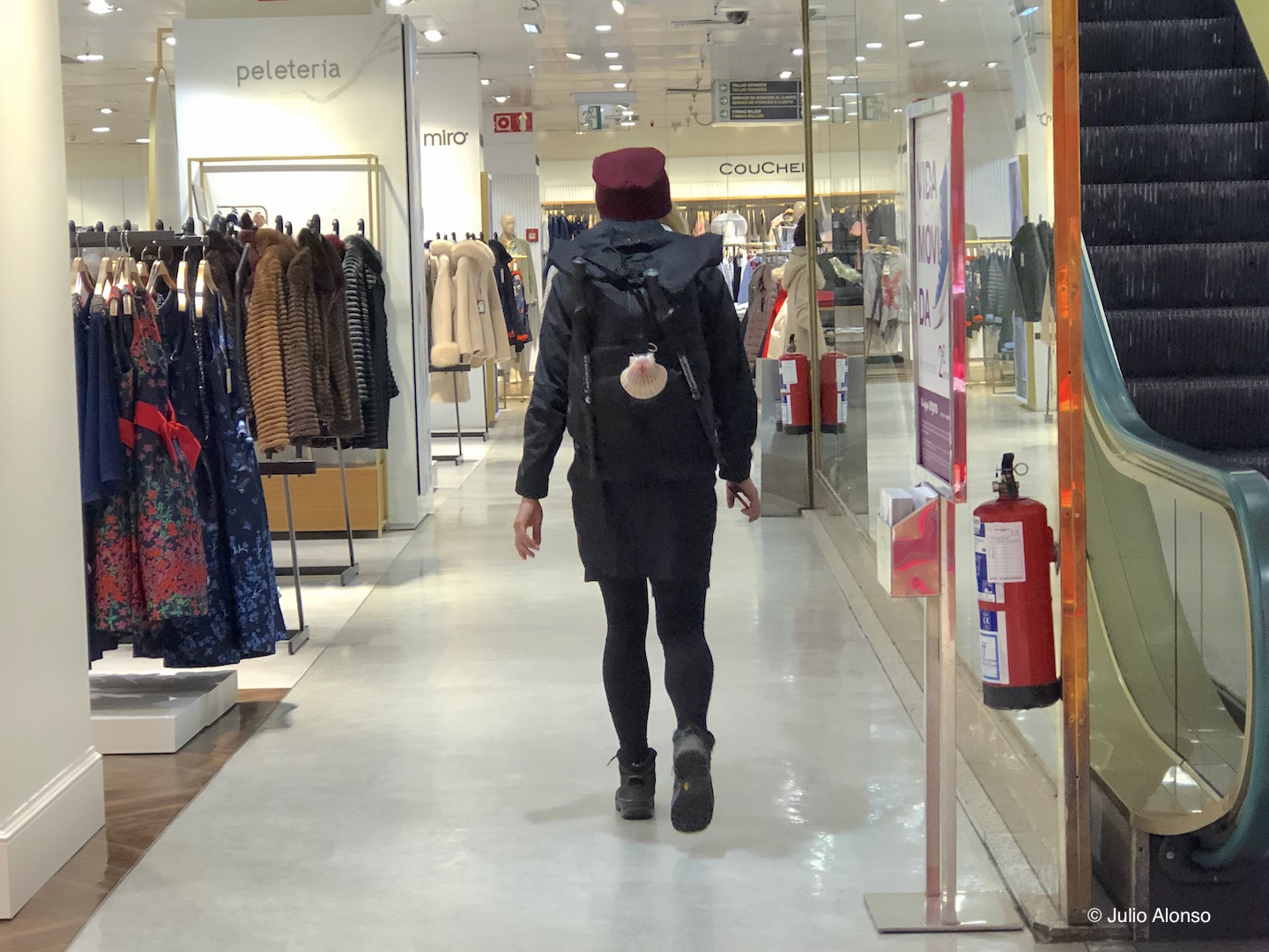Esta instantánea está tomada hace unos días en el interior de los grandes almacenes El Corte Inglés, de Vigo. Puede observarse a una peregrina caminando con paso decidido por los pasillos del establecimiento entre las tiendas de importantes marcas de ropa. Va pertrechada con su mochila, sus botas de montaña, su anorak y su gorro.