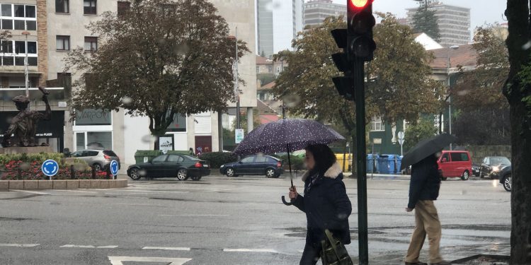 Al mismo tiempo, un señor mayor, a la derecha de la imagen, cruza por donde no debe, fuera del paso de cebra, sin importarle el peligro del tráfico, pero demostrando que sí le importa, en cambio, la lluvia intensa, puesto que también lleva un paraguas. Lo único que permanece impasible en un día tan desapacible y con tanta lluvia es la estatua que está en el medio, construida por Guillermo Steinbrüggen con múltiples piezas metálicas soldadas. La estatua es conocida como Monumento al Herrero (Monumento ao Ferreiro), y está dedicada a los trabajadores del sector del metal, cuya actividad nunca cesa aunque llueva.