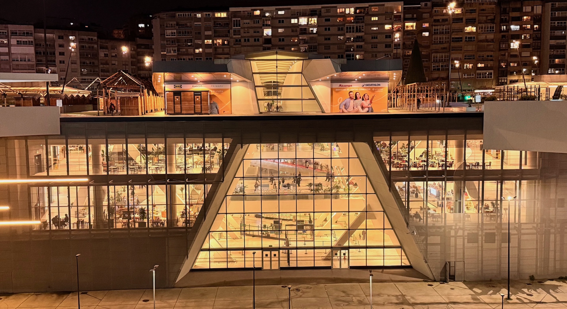 Esta es la impresionante vista del centro comercial Vialia, en la ciudad de Vigo, una fotografía tomada desde el Halo, una instalación circular que destaca en el perfil de la urbe y que está dotada con servicio de ascensores que comunican con la parte más baja de la ciudad, consiguiendo romper una barrera arquitectónica de cotas muy diferenciadas, lo cual facilita la comunicación y la vida de vecinos separados por poca distancia, pero por una altura considerable.