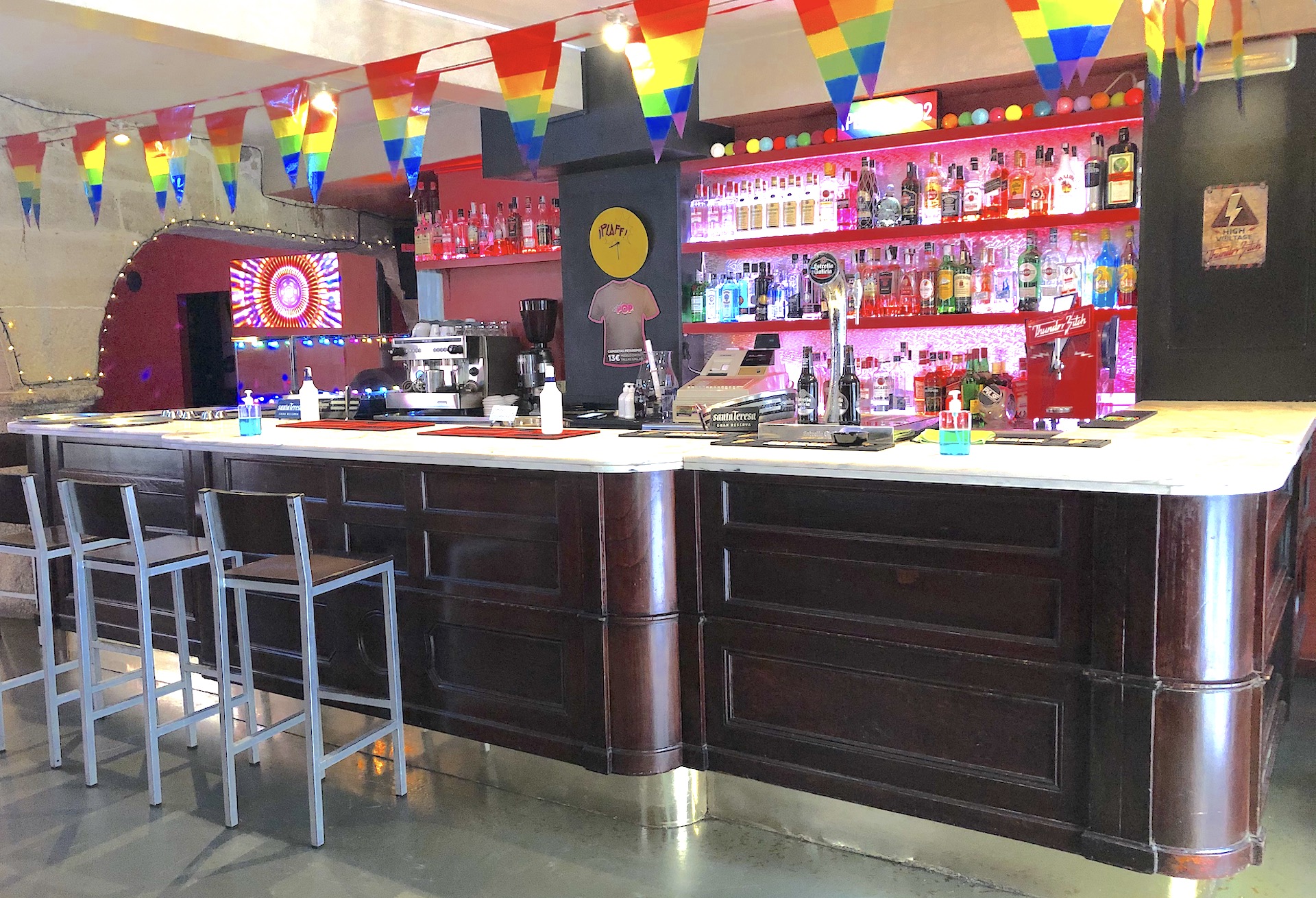 Esta barra que se muestra en la fotografía es la auténtica barra del bar americano del antiguo Hotel Universal, de Vigo, y ahora está en el Café Bar Plaff, en el número 8 de la Rúa Oliva. El Hotel Universal es autoría del arquitecto Jenaro de la Fuente y se construyó a finales de los años ochenta del siglo XIX en la Rúa Cánovas del Castillo, en la confluencia de la Rúa Carral y la Rúa García Olloqui. En sus primeros tiempos estuvo en primera linea frente al mar, aunque los sucesivos rellenos fueron alejándolo.