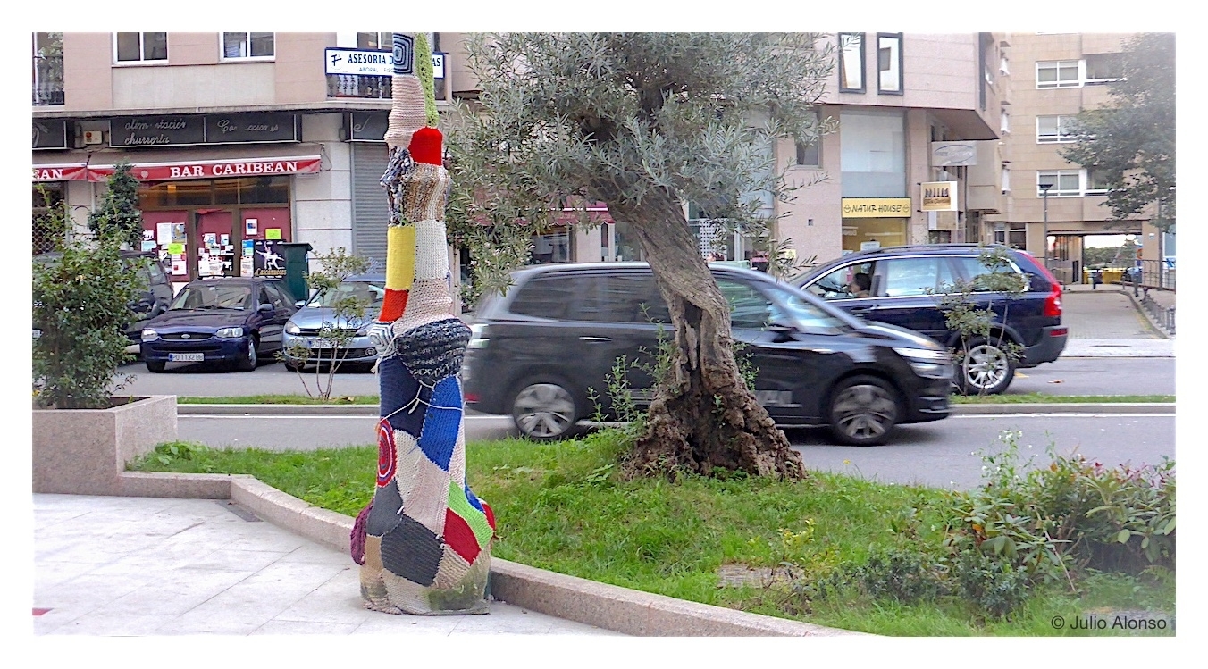 Ahora está de moda el ganchillo en las calles, para vestir elementos del mobiliario y del alumbrado público. La fotografía, tomada en al calle Rosalía de Castro, de Vigo, da muestra de ello. Observamos una farola forrada con una colorista bufanda cuya manufactura habrá llevado tiempo y dedicación a quienes apuestan por un arte urbano que todavía pasa inadvertido para algunos transeúntes, pero que se va extendiendo por todas partes.