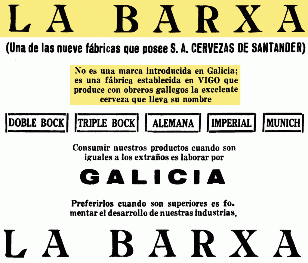 Aunque en Vigo ya hubo algún fabricante pequeño de cerveza, el hito importante en nuestra ciudad fue la inauguración de la fábrica «La Barxa» en 1925 que pertenecía al grupo Cervezas de Santander.