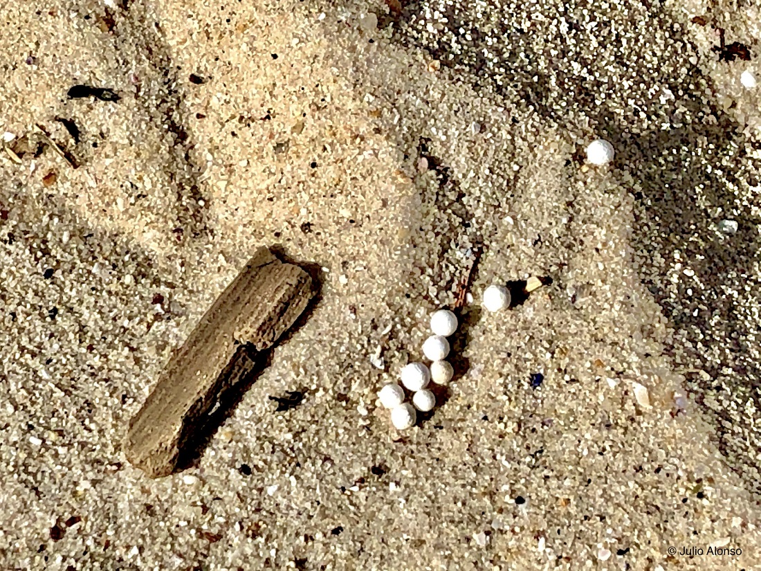 Esta fotografía está tomada en la playa de Os Olmos, en la ciudad de Vigo. Esas pequeñas bolas blancas que se aprecian en la imagen y que llenan casi todo el arenal son residuos de plástico. La playa se limpia todos los días y los primeros usuarios perciben esa limpieza. A primeras horas aún son visibles las huellas de las ruedas del tractor. Sin embargo, ese tipo de residuos no es nada fácil de eliminar porque su tamaño es muy pequeño y las bolitas se cuelan por los orificios de la malla. Las bolas corresponden a ese plástico blanco tan utilizado en embalajes de todo tipo, que resulta muy quebradizo y que se desmenuza fácilmente.