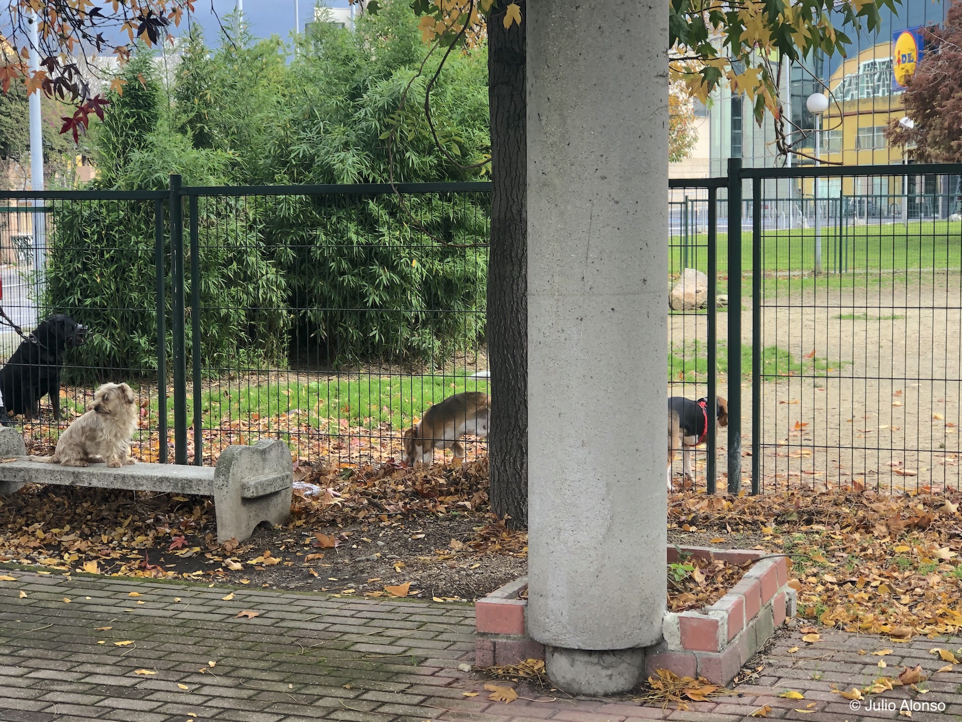 Curiosamente, el pequeño perro está en el lado de lo que podríamos llamar libertad, porque los demás están confinados en una zona alambrada y específica para perros, un gran rectángulo provisto de doble puerta de seguridad, para que no se escapen. La fotografía está tomada en el parque de la Rúa Coruña, en Vigo, en lo que se conoce como parque canino da Praza García Picher. Se deduce que los confinados están muy felices, lo contrario del perro que está en libertad.