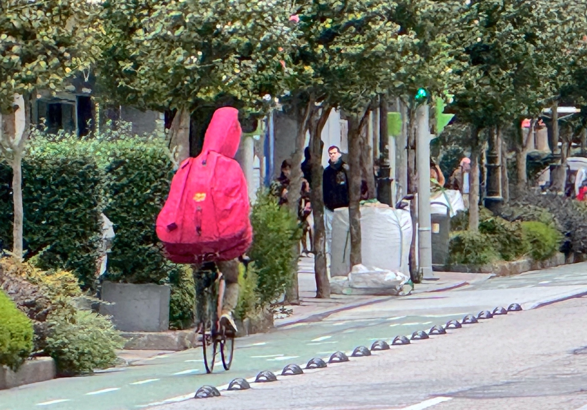 La escena de la fotografía no es habitual y se ha captado en una céntrica calle de la ciudad de Vigo, donde el tráfico resulta muy denso en algunas horas punta y es preferible desplazarse en bicicleta. Son las ventajas del carril bici.