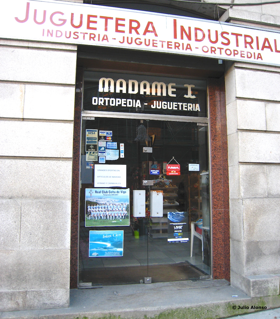 Hace muchos años que tomé esta fotografía de la entrada de Madame X, un establecimiento dedicado a ortopedia y juguetería en la Plaza de Compostela de la ciudad de Vigo. Durante mi niñez, para mí sólo era una juguetería. Igual que los desaparecidos almacenes Tobaris, ubicados en la Rúa Marqués de Valladares, que tenían un pequeño anexo en las galerías de La Norma, en la Rúa do Príncipe. Eran jugueterías de aquellos tiempos, igual que Moya, también en la Rúa do Príncipe. Igual que el Bazar de Villar, en la Rúa Velázquez Moreno, que ocupaba un local muy amplio de dos plantas donde había estado el Gran Café Colón. Después del Bazar de Villar, ese mismo local se convirtió en los Almacenes El Pilar y actualmente es La Casa del Libro.