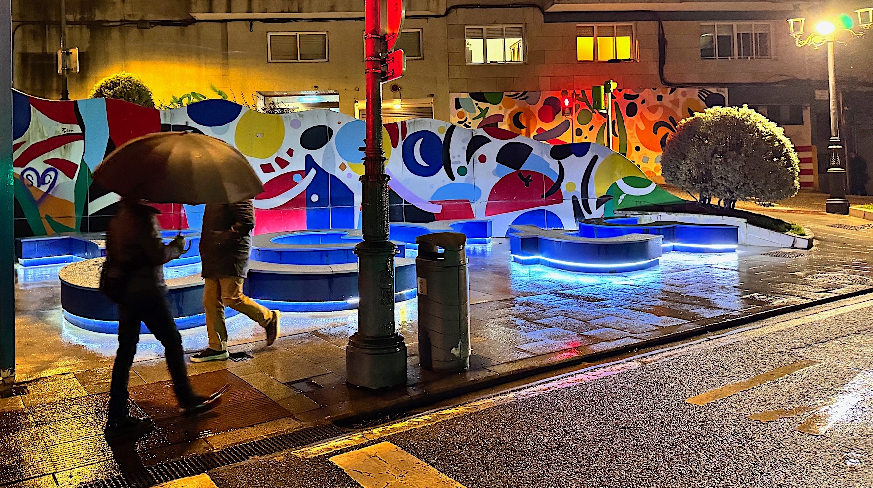 Esta es la vista nocturna de la Praza das Apertas, en la ciudad de Vigo, y que fue diseñada por el artista Antón Pulido. El diseño constituye una inyección de color, de luz y de energía positiva en una zona de la ciudad que hasta el momento de la inauguración siempre ha sido conocida exclusivamente como Peniche, en la confluencia de la Rúa Pi y Margall, la Rúa López Mora, la Rúa Tomás Alonso y el Camiño dos Pazos. En esta zona estaba ubicada una oficina del antiguo fielato, uno de los controles que durante décadas existían en las entradas de las ciudades para controlar el transporte de los productos de primera necesidad en tiempos de posguerra y racionamiento, y que en Vigo llegaron a estar en funcionamiento hasta pasado el mediado del siglo XX. La Praza das Apertas, diseñada por Antón Pulido, ha contribuido, por lo tanto, a llenar de vida un espacio urbano que antes era totalmente gris.