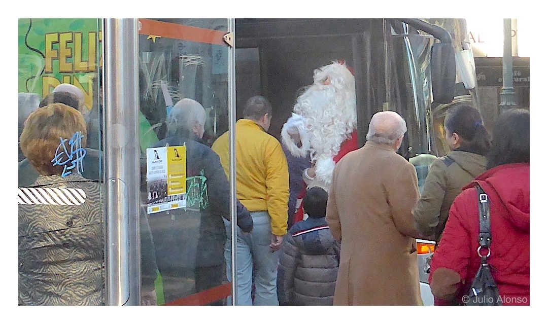 Hasta hace unos años nadie celebraba la Navidad con Papá Noel. Celebrábamos la noche de Reyes, con los Reyes Magos, y la ilusión infantil alcanzaba su máximo clímax con la cabalgata y la noche mágica del día cinco de enero. Pero con la disculpa de que los pequeños tienen más tiempo para jugar si los regalos se les entregan en la noche de Navidad, la costumbre se ha ido imponiendo y nuestros Reyes Magos han quedando relegados a un segundo plano. Así es que Papá Noel ya está en todas partes, incluidos los autobuses urbanos, y para muestra esta fotografía tomada en el centro de la ciudad de Vigo.
