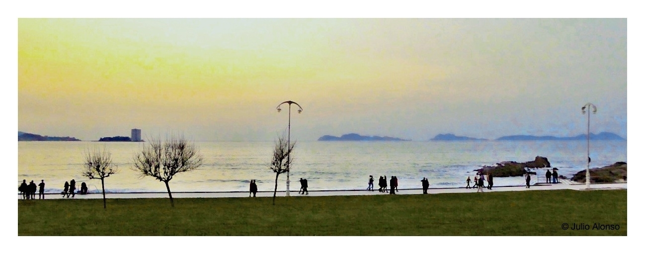 Cuando escampa, muchas personas aprovechan para pasear el frío invernal por las calles y plazas y otras tantas acuden a la playa de Samil para disfrutar del aire libre, de los colores casi irreales del atardecer, del olor del mar, del sonido de las olas al romper contra la arena, y de las inigualables vistas de las islas Cíes marcando el horizonte, delimitando esa línea entre lo real y lo imaginario, esa frontera que nos separa de ese idílico paraíso que tenemos tan cerca en la ciudad de Vigo.