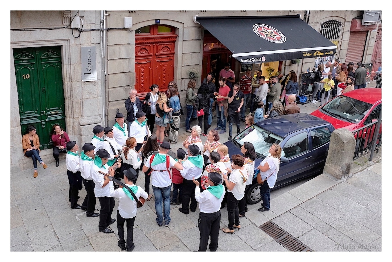 En tiempos pretéritos se decía que en el reino de España no se ponía el sol, pero Portugal podría haber dicho lo mismo, pues sus territorios también se extendían a lo ancho del mundo. En aquellos tiempos, el planeta estaba repartido, fundamentalmente, entre España y Portugal. Pero el devenir de los acontecimientos históricos, en el que han destacado las malas gestiones políticas, el despilfarro económico en tiempos de bonanza, y otros factores quizá de menor enjundia, pero que también influyeron de modo definitivo en el desenlace, llevaron a los dos países a ver reducidas sus posesiones en ultramar. Hemos estado hermanados a lo largo de La historia y seguimos estándolo, principalmente, Galicia y Portugal. Ahora son tiempos de celebración y de fiesta, y la alegría portuguesa ha inundado las calles del Casco Vello de Vigo con sus tamborradas y sus animados pasacalles, tal como se observa en esta fotografía, a las puertas de La Mina.