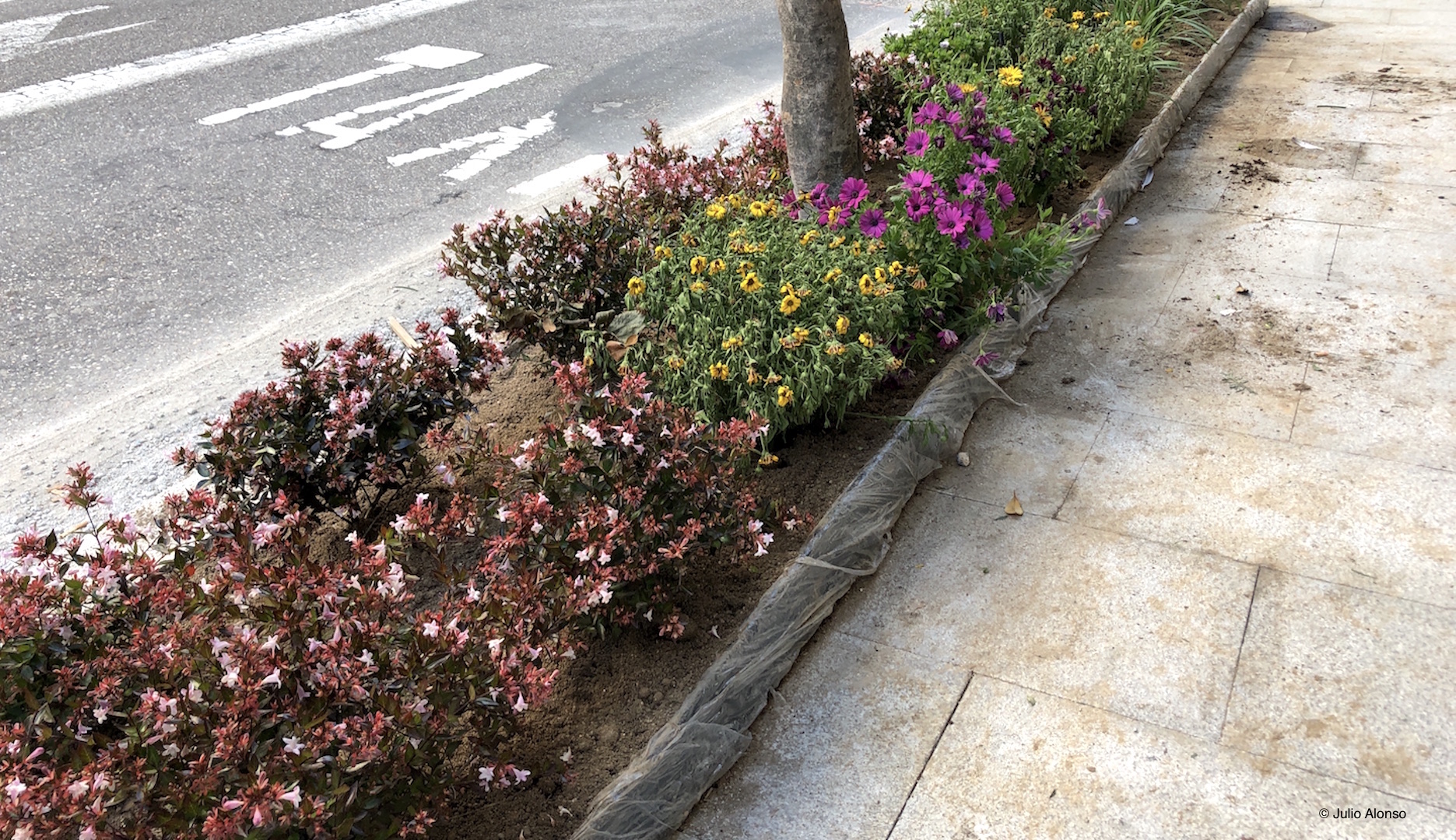La ciudad de Vigo está llena de jardineras que embellecen sus aceras y plazas. De vez en cuando, aunque no siempre con la frecuencia deseada por la ciudadanía, un equipo humano se encarga de limpiar, abonar y plantar nuevos ejemplares. Incluso en alguna zona de la ciudad son los mismos vecinos los que se encargan del cuidado, tal como ocurre en la Rúa Venezuela a la altura del colegio de los Salesianos, como ya hemos comentado en otra ocasión.