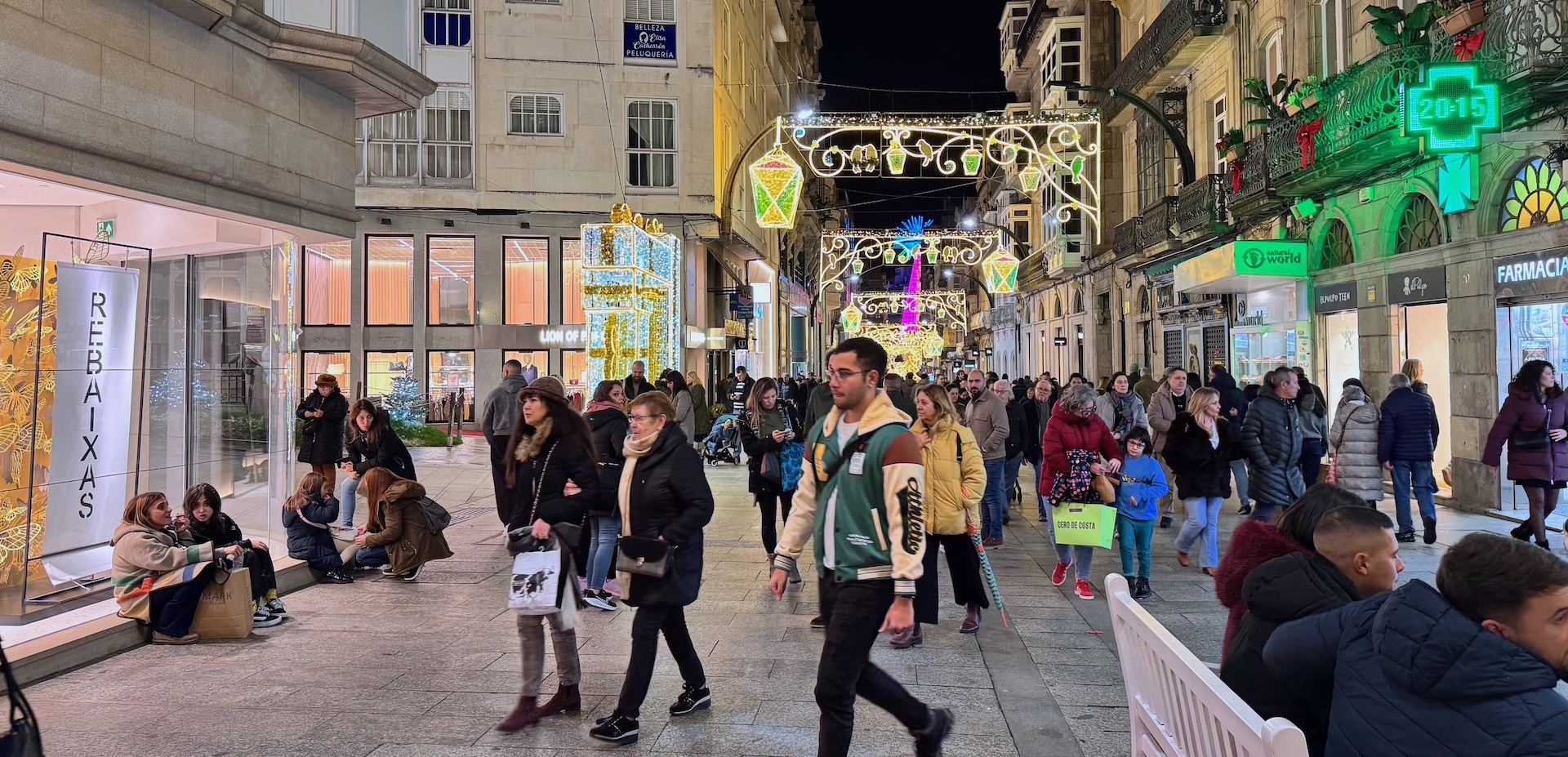 Esta fotografía da testimonio de la aglomeración de gente que llenó las calles de Vigo durante los primeros días de las rebajas de enero, prácticamente sin lluvias. En este caso, la imagen corresponde a la Rúa Príncipe, sin embargo, la Rúa Urzaiz incluso presentó un lleno todavía mayor que, para muchas personas que vivieron esa curiosa circunstancia, era comparable a la Gran Vía de Madrid, con las aceras casi intransitables y los comercios completamente llenos. No se puede obviar que Vigo es una ciudad comercial y el movimiento de los establecimientos comerciales de todo tipo es fundamental para la economía local y su área de influencia. Es de esperar que ese torrente humano desplazándose por las calles y entrando y saliendo de los comercios haya tenido realmente una repercusión positiva en las ventas, porque no siempre se corresponden la realidad con la apariencia.