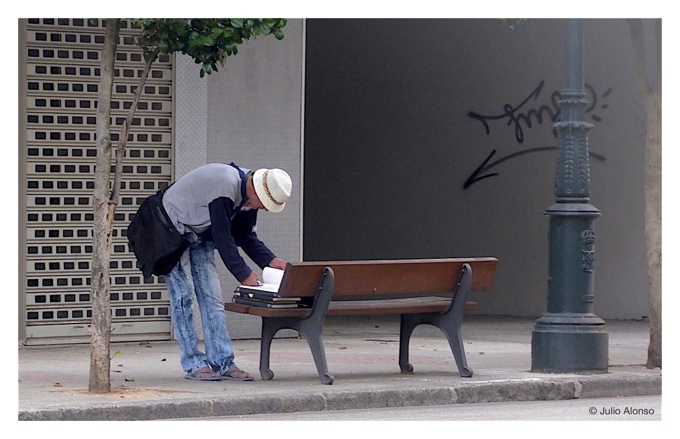 Además, el libro electrónico ha irrumpido entre los lectores como una opción mucho más cómoda para facilitar la lectura y el transporte de una gran biblioteca personal a cualquier parte. Sin embargo, el libro en papel, el de soporte convencional, sigue gozando de numerosos adeptos que prefieren su tacto, su imagen, su color e incluso su olor. Porque la lectura y disfrute del libro de papel va acompañado de un ritual que no tiene parangón con el electrónico. Y la bajada de precio de los soportes electrónicos e incluso el precio de los libros digitales va ganando terreno y favorece que en las viviendas actuales, cada vez más pequeñas, pueda ganarse un poco más de espacio a costa de eliminar las grandes bibliotecas de papel. Y como quien ama de verdad los libros nunca los elimina en el contenedor de basura, o bien los regala, puesto que su valoración en el mercado de segunda mano es irrisorio, o los abandona a su suerte en algún rincón o algún banco para que los recoja —-o adopte—- otro amante de esas joyas de arte que nos enseñan y divierten. Y ahí está la fotografía como testimonio del interés que manifiesta un viandante que encuentra unos libros en un banco de una céntrica calle de la ciudad de Vigo. Y todo hace pensar en que el libro en papel ganará su propia batalla y coexistirá con el electrónico, de un modo similar a como ha acontecido con la radio cuando la televisión irrumpió en nuestros hogares.