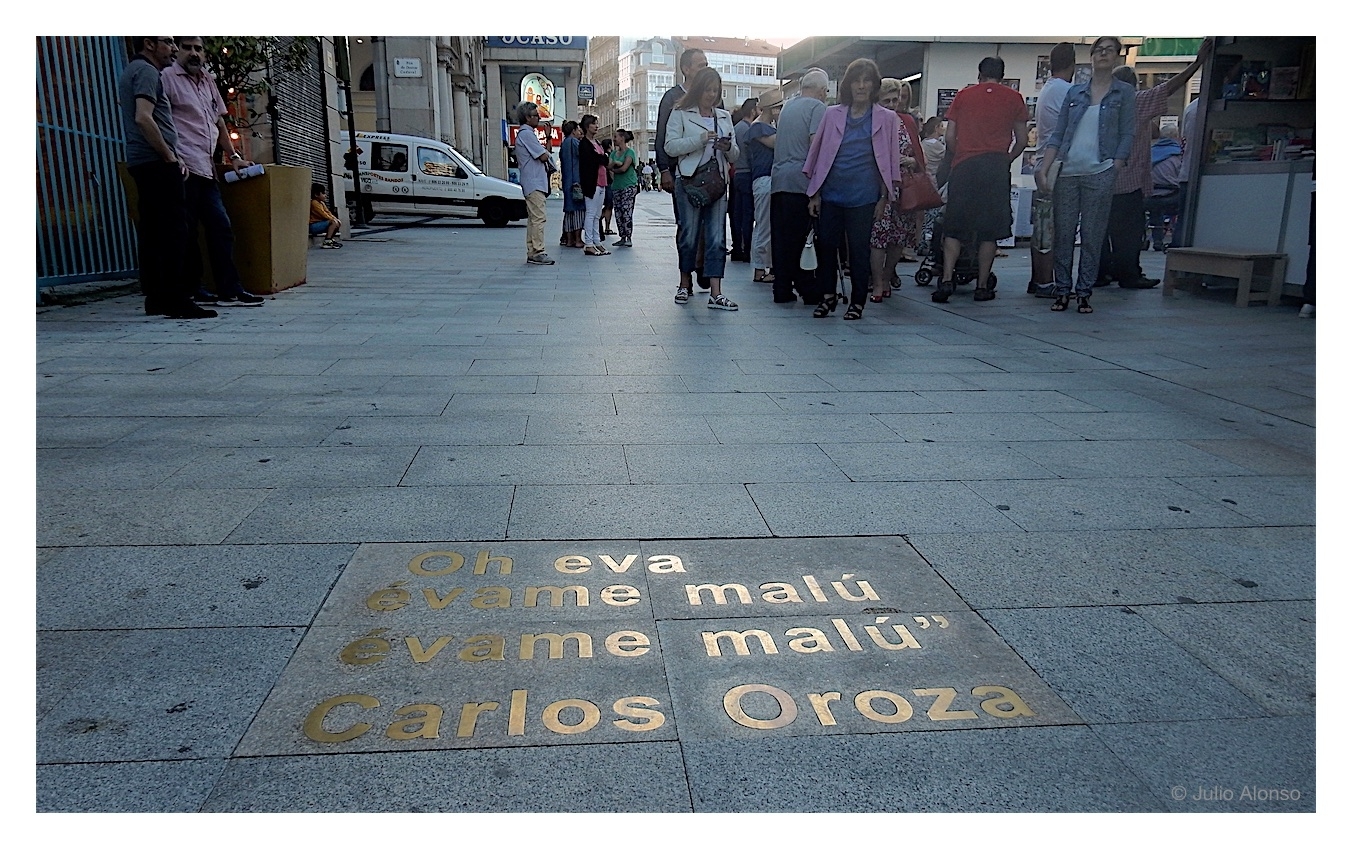 Después de muerto, la poesía de Carlos Oroza sigue igual de viva e intensa y no deja a nadie indiferente, y para recuerdo constante de esa profunda creatividad se ha puesto un fragmento de sus versos en unas losetas por las que no hace mucho tiempo aún caminaba el poeta.