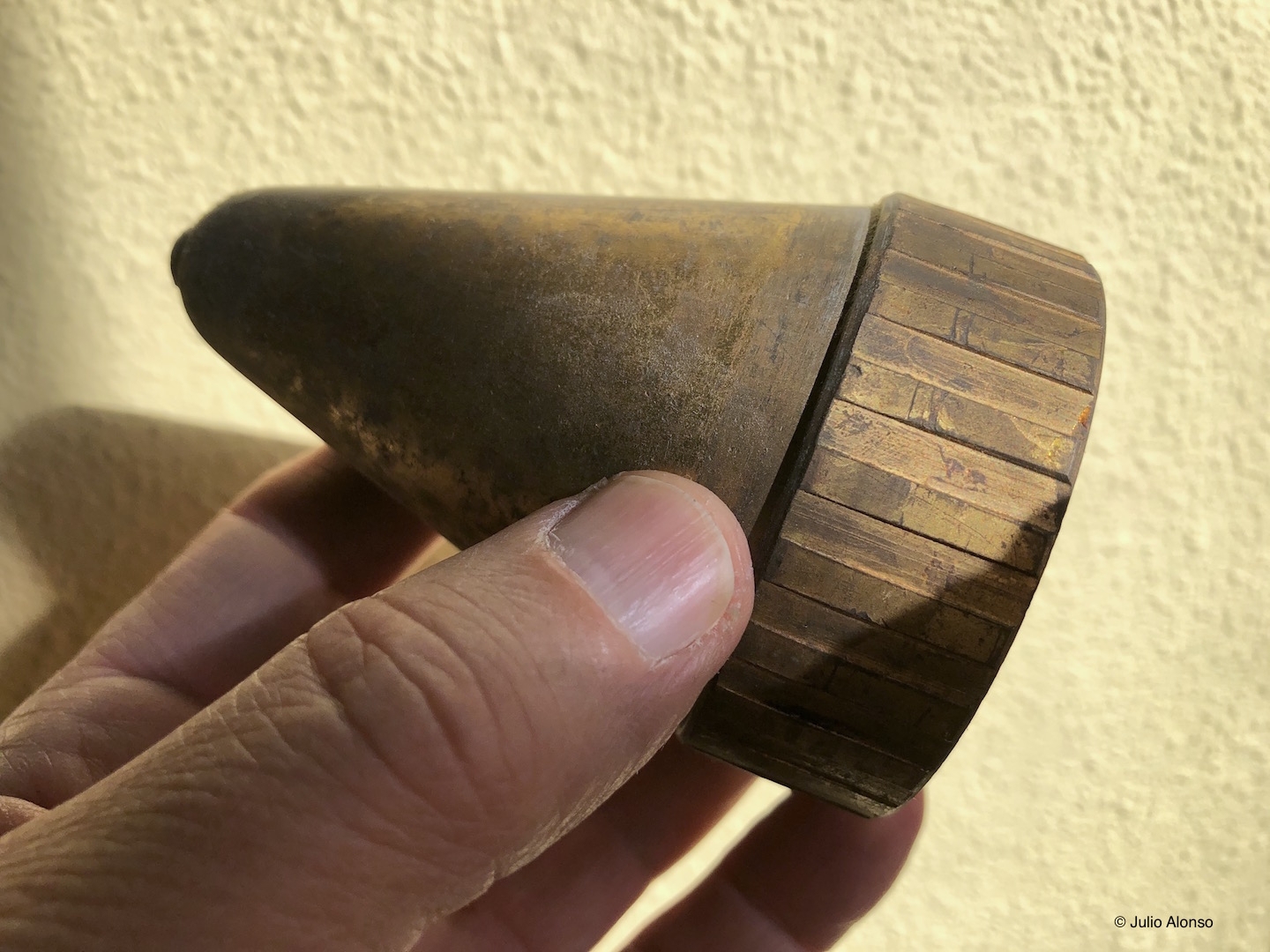 Esta pieza, auténtica, corresponde a un casquillo protector de un proyectil de mortero utilizado durante la guerra civil española. Está fabricado de latón e iba roscado sobre la cabeza del proyectil, protegiendo su parte más sensible.