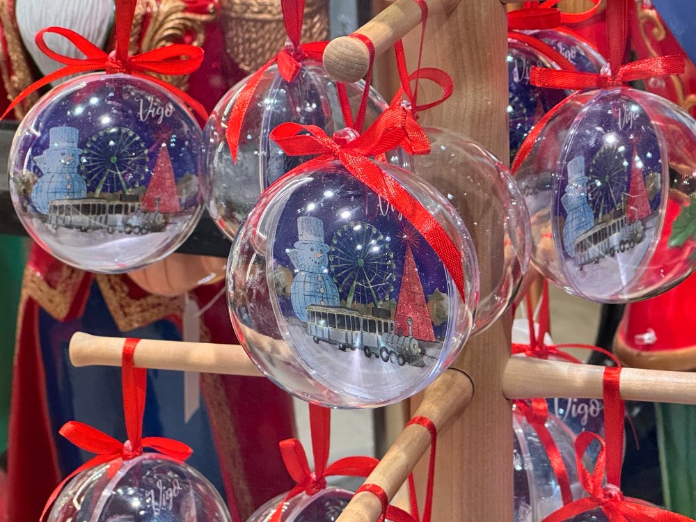 La Navidad de Vigo también tiene sus objetos de recuerdo para que los lleven los visitantes o para que también los disfrute la ciudadanía viguesa. Sirvan como ejemplo estas vistosas bolas transparentes realizadas en plástico para adornar los árboles navideños, o siquiera para decorar cualquier rincón de la casa. Las bolas recogen estampas de la Navidad en Vigo, con sus luces y sus elementos decorativos. Están fabricadas de modo artesanal y las hemos descubierto en un establecimiento de la Rúa Velázquez Moreno. Pero en relación con la Navidad y las luces de Vigo también se han inventado dulces, que resultan un agradable recuerdo, aunque perecedero, y que van empaquetados en una caja con una decoración al uso. Está claro que la Navidad de Vigo va generando ideas de negocio y ahora sólo falta que despegue alguna línea de ropa viguesa, alguna tarta o pastel exclusivo y, quizá, alguna canción navideña inspirada en la ciudad olívica. Todo se andará.