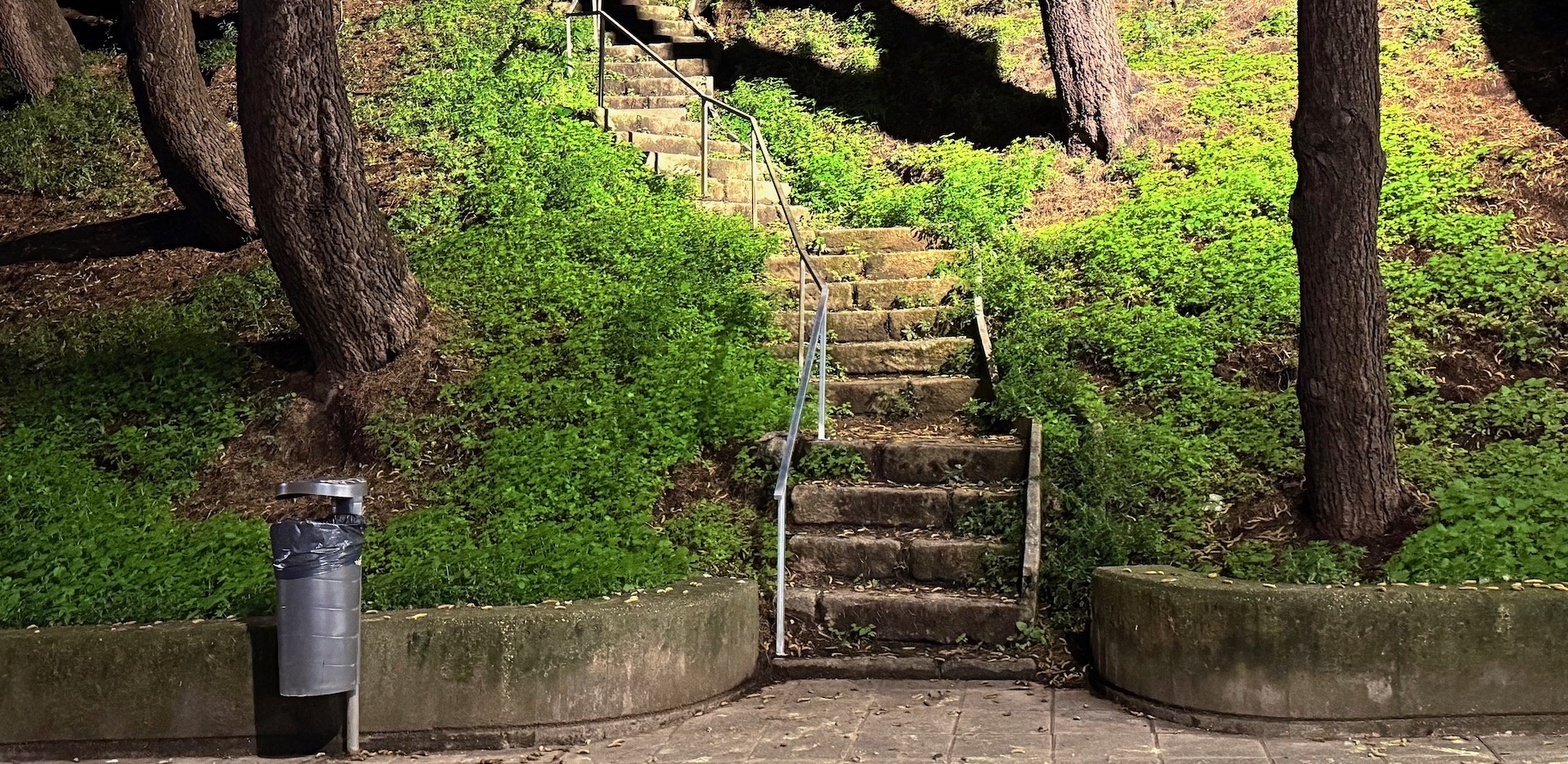 En el centro de la ciudad de Vigo, y al margen de sus numerosos parques, todavía pueden encontrarse rincones boscosos más o menos densos que no dejan de sorprender, a pesar de ser una urbe llena de asfalto y de hormigón. Ahí está, sin ir más lejos, esta imagen en la que puede observarse uno de esos rincones, en este caso es el comprendido entre las calles Cachamuiña, Falperra y la Avenida das Camelias, con unas escaleras que comunican dos cotas de la ciudad olívica y que discurren entre hierba y árboles de gran tamaño y belleza. Sin embargo, no es el único ejemplo, aunque el urbanismo avanza imparable y el desarrollo va cubriéndolo todo porque los árboles no resultan tan rentables como el cemento. De seguir así, lo pagaremos caro.